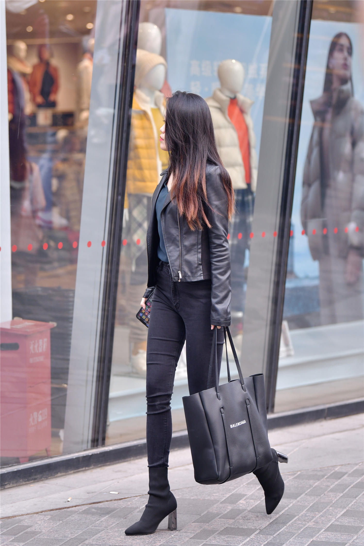 很多姑娘为了展示身材,选择修身牛仔裤,搭配一双高跟鞋,更好的展示身材的高挑,牛仔裤搭配高跟鞋,可以更好的展示身材,现在看一下这位美女的搭配,黑色的修身牛仔裤,高腰的款式,这样可以很好的展现身材比例,脚下一双黑色尖头粗跟的袜靴,也是很显瘦增高的搭配,黑色皮夹克,让整体的黑色搭配,增加质感,也是很好看的秋季搭配。