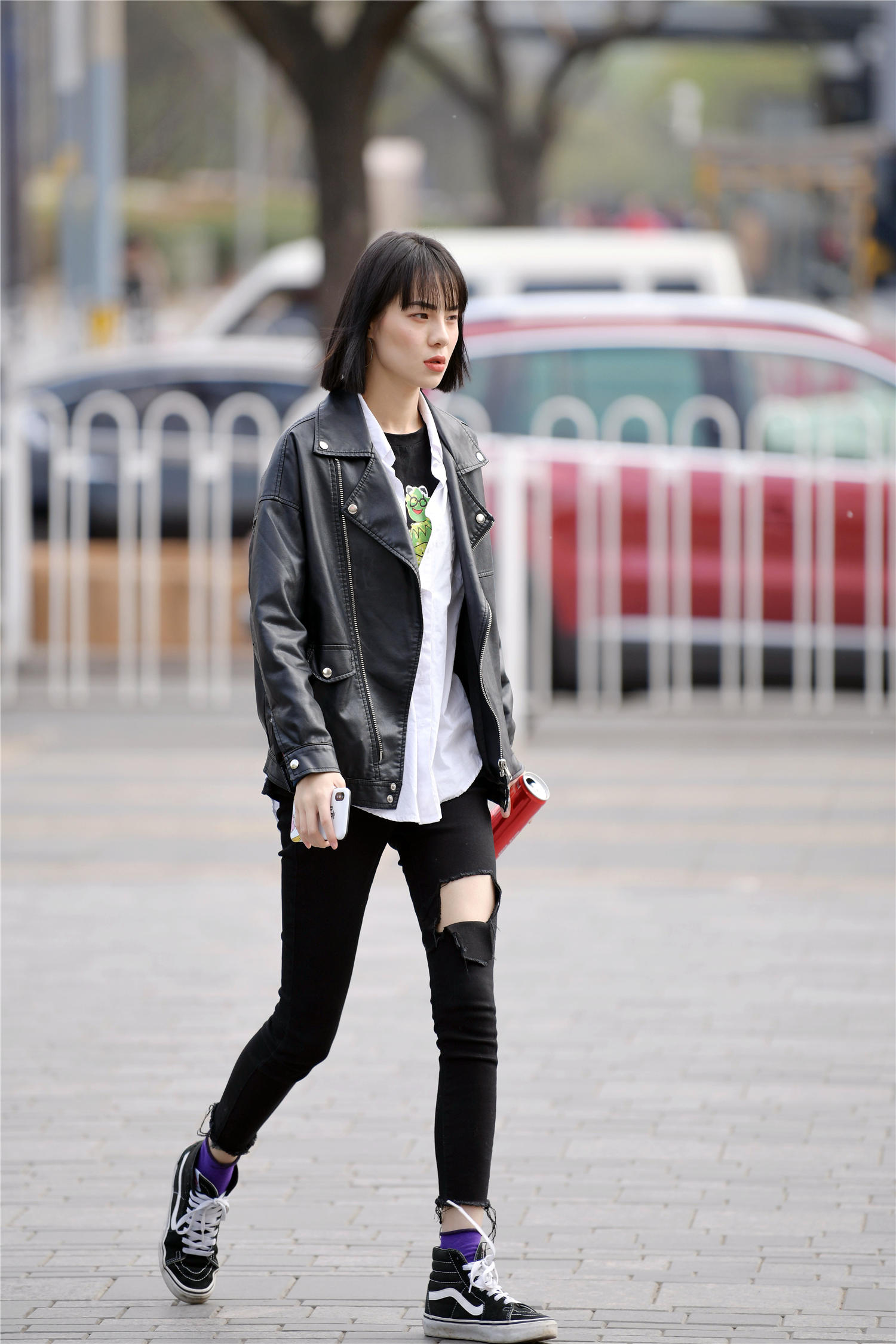 在秋天里,无论是选择修身牛仔裤还是宽松的款式,自己喜欢就好,平底鞋和高跟鞋,每个人想法不一样,搭配也不同,这位美女选择修身的破洞牛仔裤,黑色会有着显瘦的效果,毛边的裤腿,搭配一双帆布鞋,简单个性,黑色的皮夹克,不是短衣襟的款式,一件白色衬衫,增加色彩对比,这样有了黑白色的搭配效果。