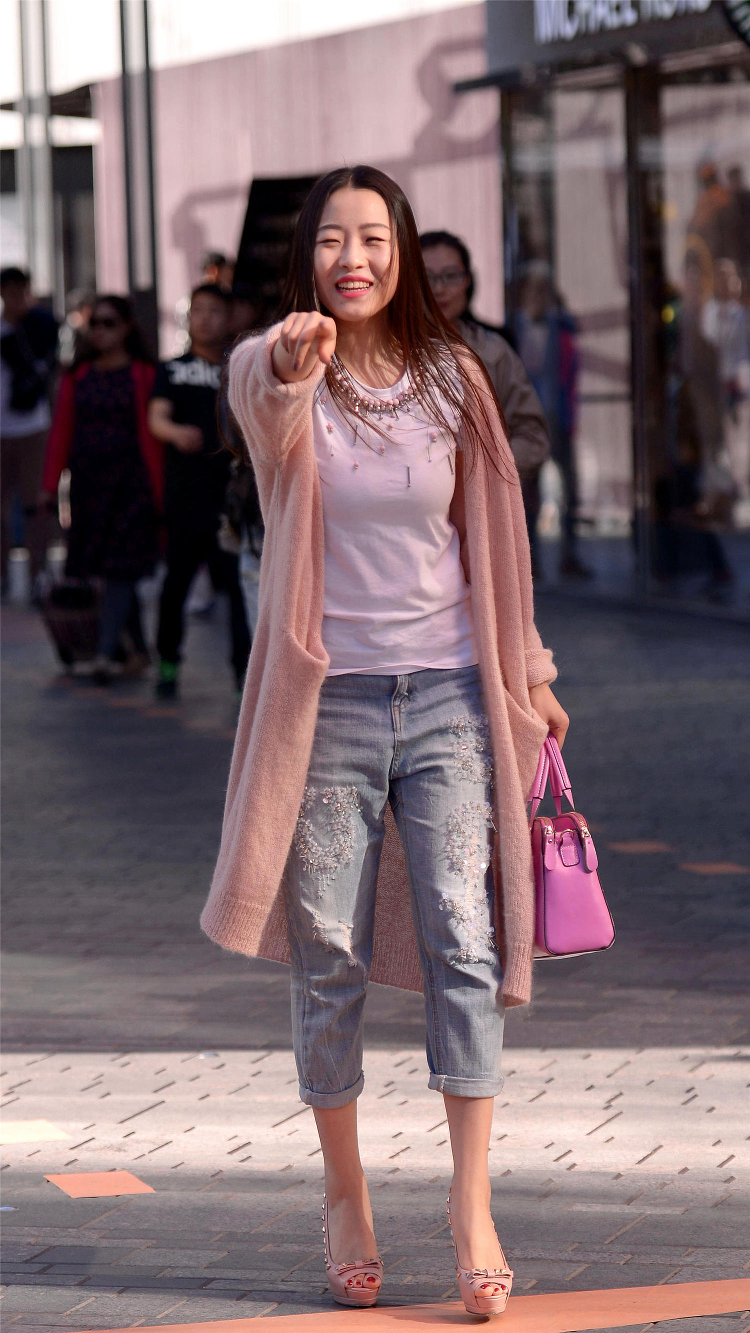 看一下这位美女的穿搭,破洞的七分牛仔裤,搭配出很精致的效果,也展现出自己的味道,牛仔裤虽然不是修身的,也是很简单的款式,搭配一件白色的衬衣,上面的粉色珠子作为装饰,非常个性的感觉,浅粉色的针织风衣,会显得更加休闲一些,飘在后面,有着秋天的搭配感觉,也穿出很有层次和色彩的效果。