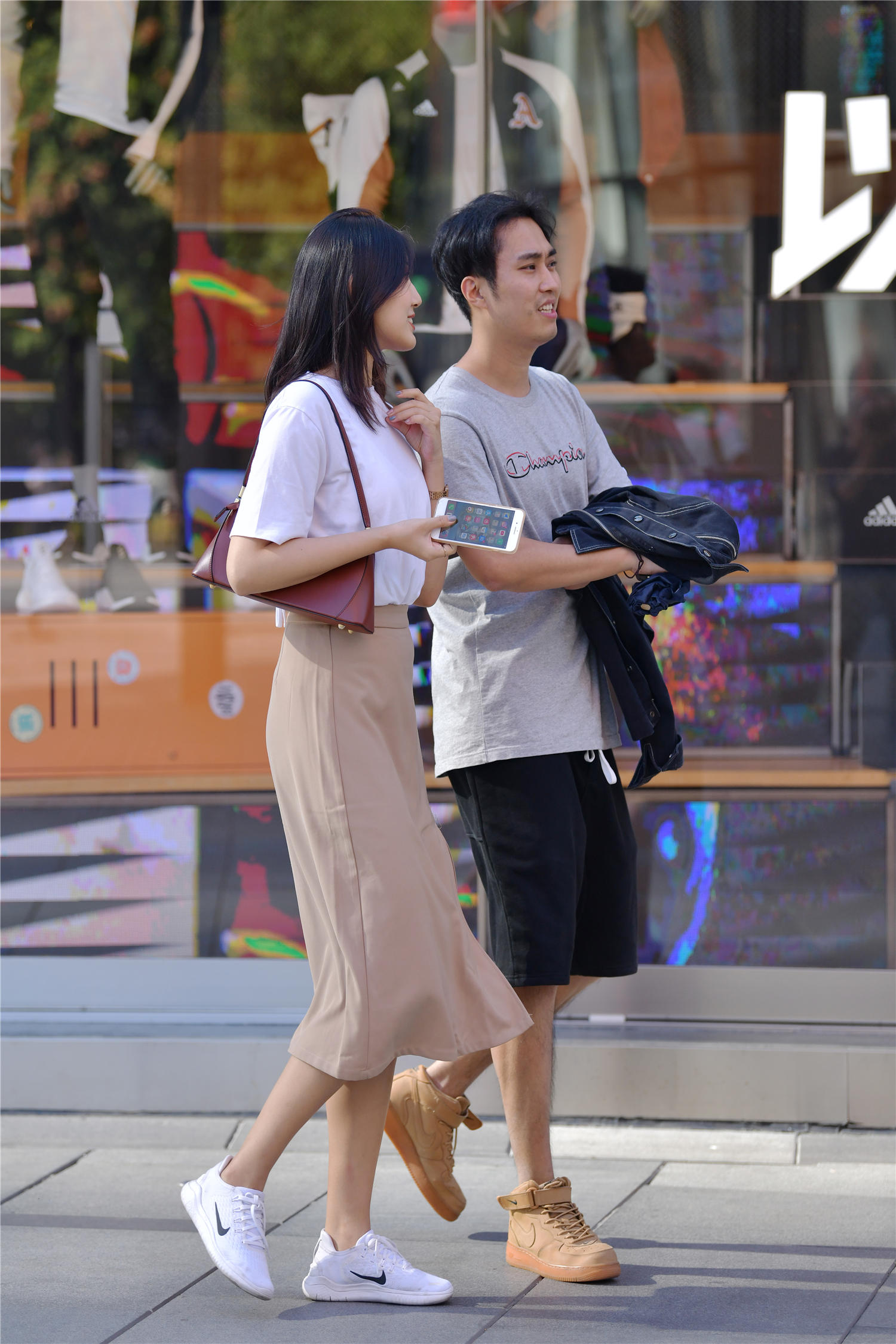 秋天的白天和晚上搭配,会有所不同,白天温度高,可以搭配得精简些,看一下这位美女,选择一款高腰半身裙,过膝的裙摆,搭配出很显身材比例的效果,搭配一件白色半袖,简单又好看,选择的衣服也很宽松,有着一点显瘦的效果,脚下的白色运动鞋,也看出姑娘是很喜欢干净的人。