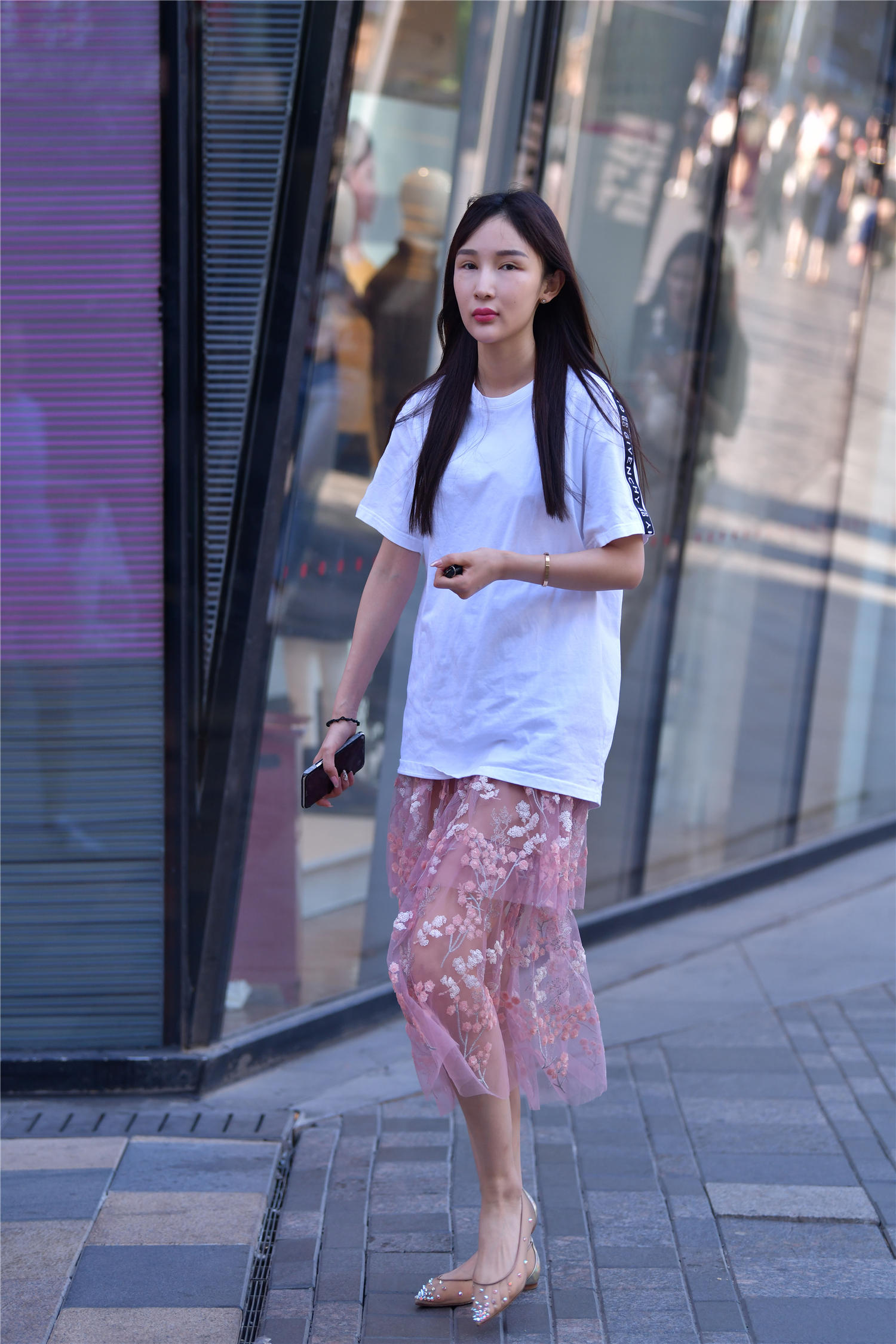 很多人喜欢裙子,也会搭配出不同的风格,半身裙会搭配出富有层次的效果,这位美女选择一条浅粉色的半身纱裙,裙摆上的提花和亮片,组成的树枝和花朵,非常漂亮,搭配一件白色的大T恤,看着很简单,没有想着展示自己的身材比例,有着很休闲的效果,脚下一双尖头平底鞋,半透明的鞋面,看起来非常精致。