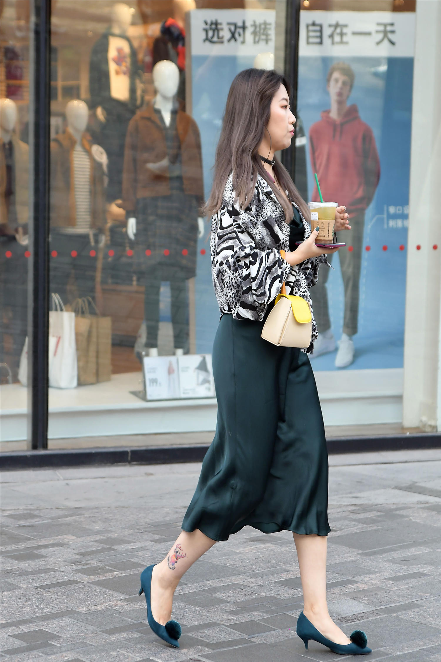 在秋天穿着裙子逛街,会很有意思,这位美女选择一款墨绿色的长裙,裙摆到小腿肚的位置,搭配一双墨绿色的尖头鞋,虽然鞋跟很低,逛街会很轻松,也会显得很秀气,鞋尖的毛绒小球,增加装饰感,黑白色纹理的外套,非常有层次的设计,看起来很精致,一身搭配很简单,也非常适合身材微胖的姑娘来搭配。