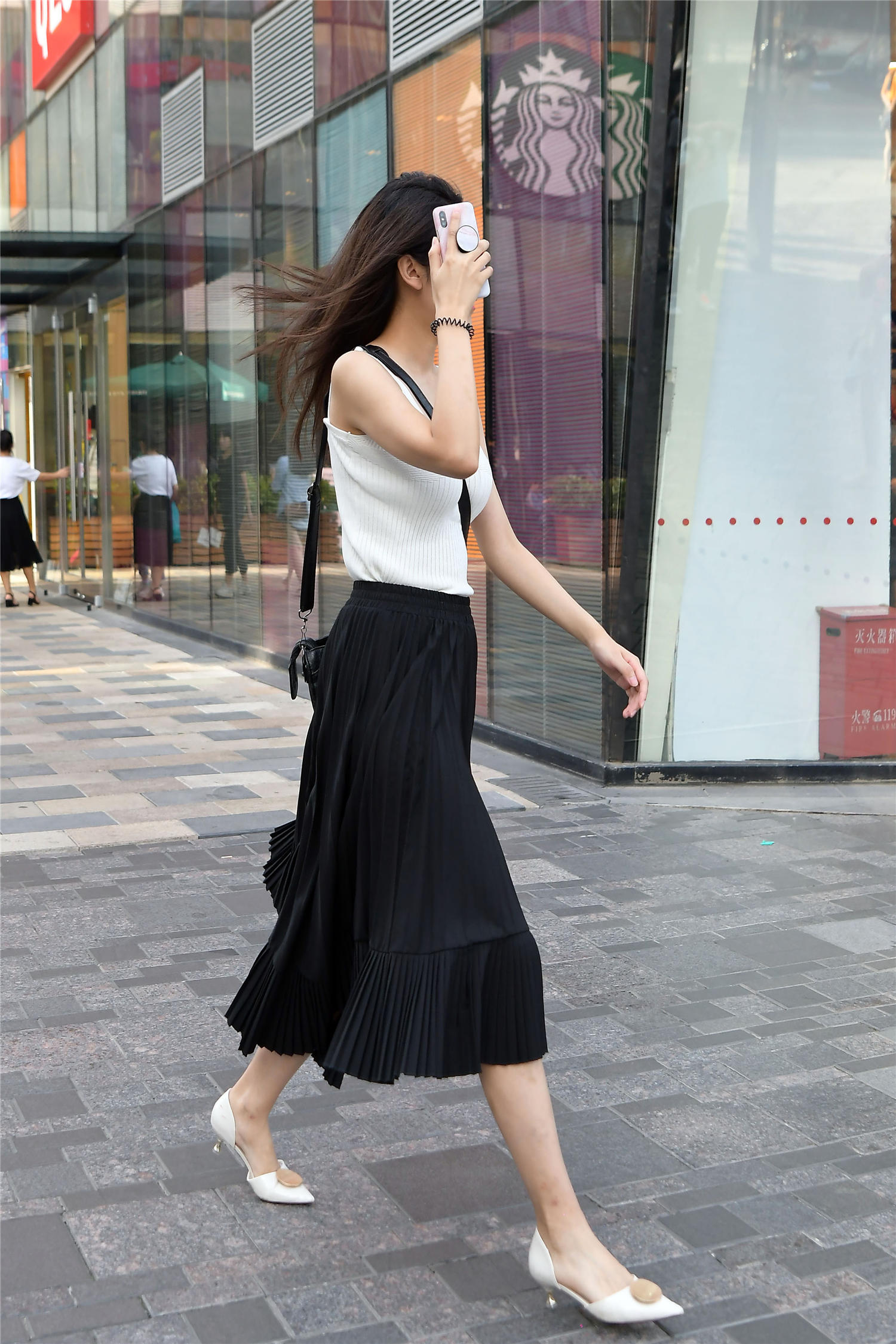 秋季搭配黑白色,会显得很简约,也让搭配变得更加容易,虽然很多人不太敢去尝试白色搭配,但是选择一些好看的白色单品,也会穿出很精致的感觉,这位美女选择一款高腰黑色半身裙,压褶的设计,增加层次感,走路也会很轻松,过膝的长度,显得简约大气,一件白色吊带,稍微有些修身的效果,脚下一双尖头细跟鞋,鞋跟不高,却非常时尚漂亮。