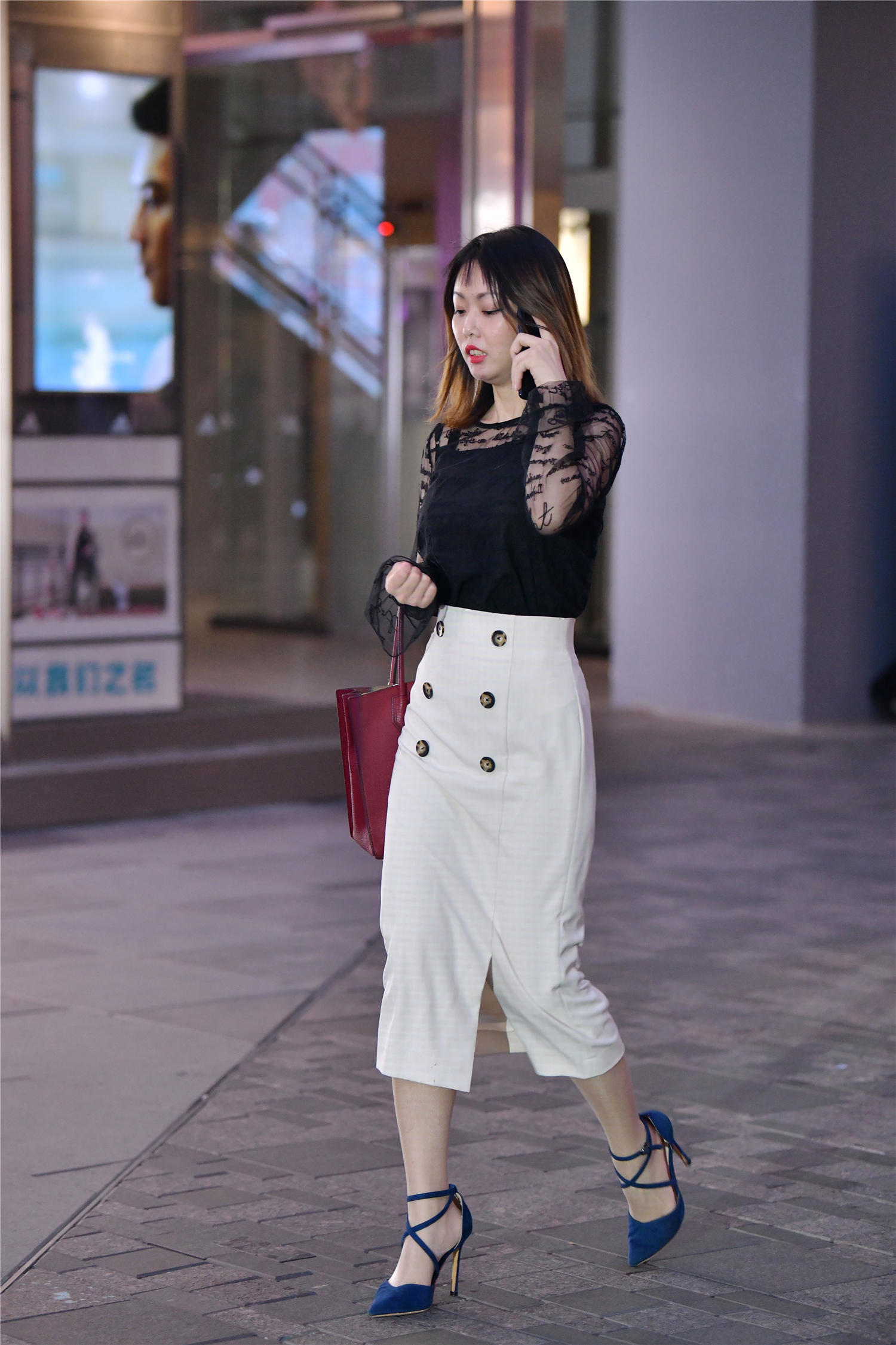 穿着裙子,搭配高跟鞋,就会很美,看一下这位美女选择一款白色半身裙,高腰的设计,这样会很好的展现身材比例,前面的双排扣,增加装饰感,裙摆的开叉,增加裙子的层次感他,也让走路更加舒适,一件黑色的小衫,领口和袖子的透视设计,会显得更有女人味,脚下一双蓝色丝绒的交叉带尖头细跟鞋,8厘米以上的高度,更好的衬托她的身材。