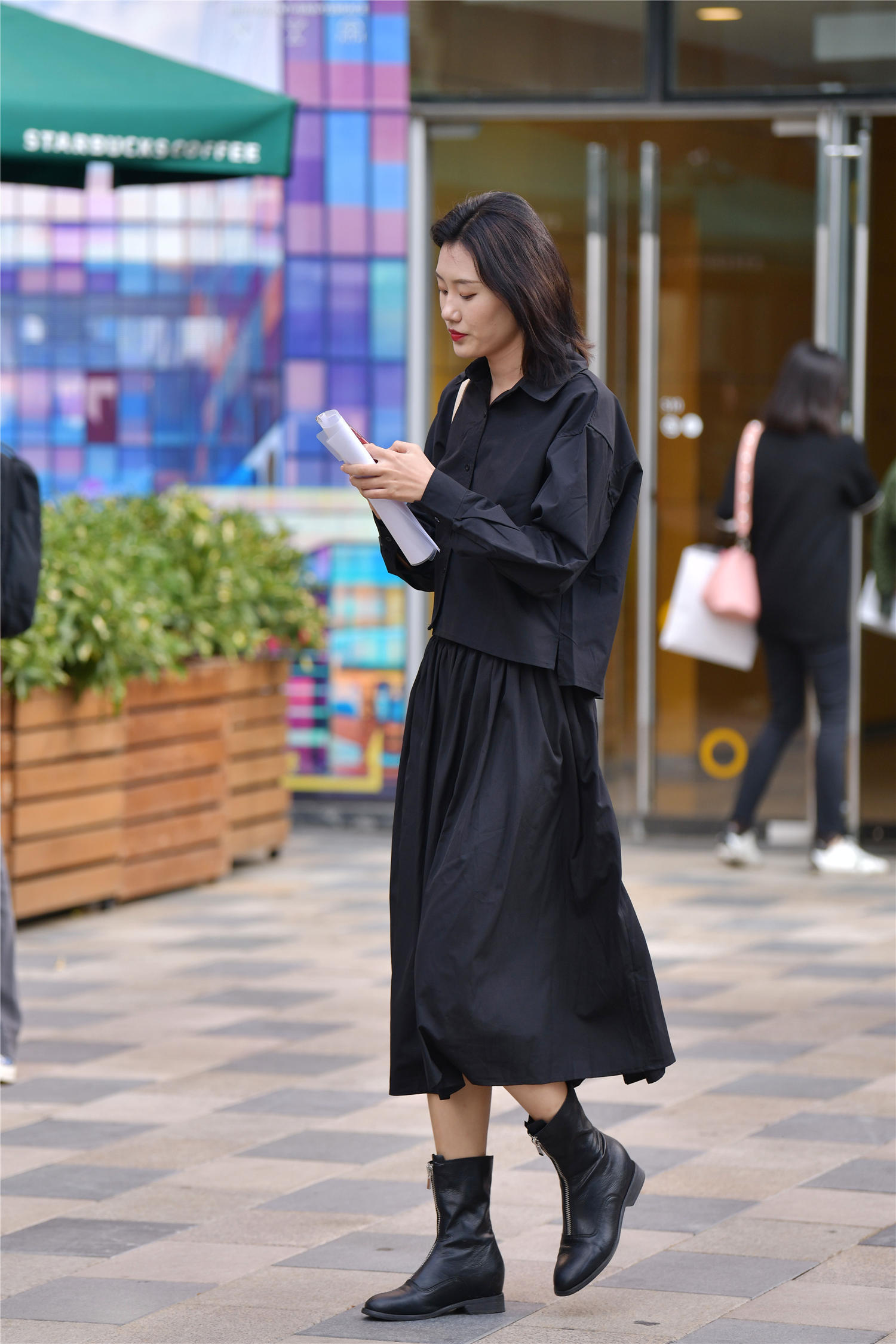 深秋时节,很多人喜欢黑色,也会把黑色搭配出很有层次的效果,看一下这位身材高挑的姑娘,黑色的半身长裙,高腰的设计,却被她的短款衬衫遮住,而且衬衫也不是传统的样式,非常个性的感觉,脚下穿着一双黑色拉链短靴,让黑色增加质感,搭配出很美的效果,这一身黑色搭配,是不是很有层次感?秋天就要搭配出自己的味道,展现出自己的个性来。