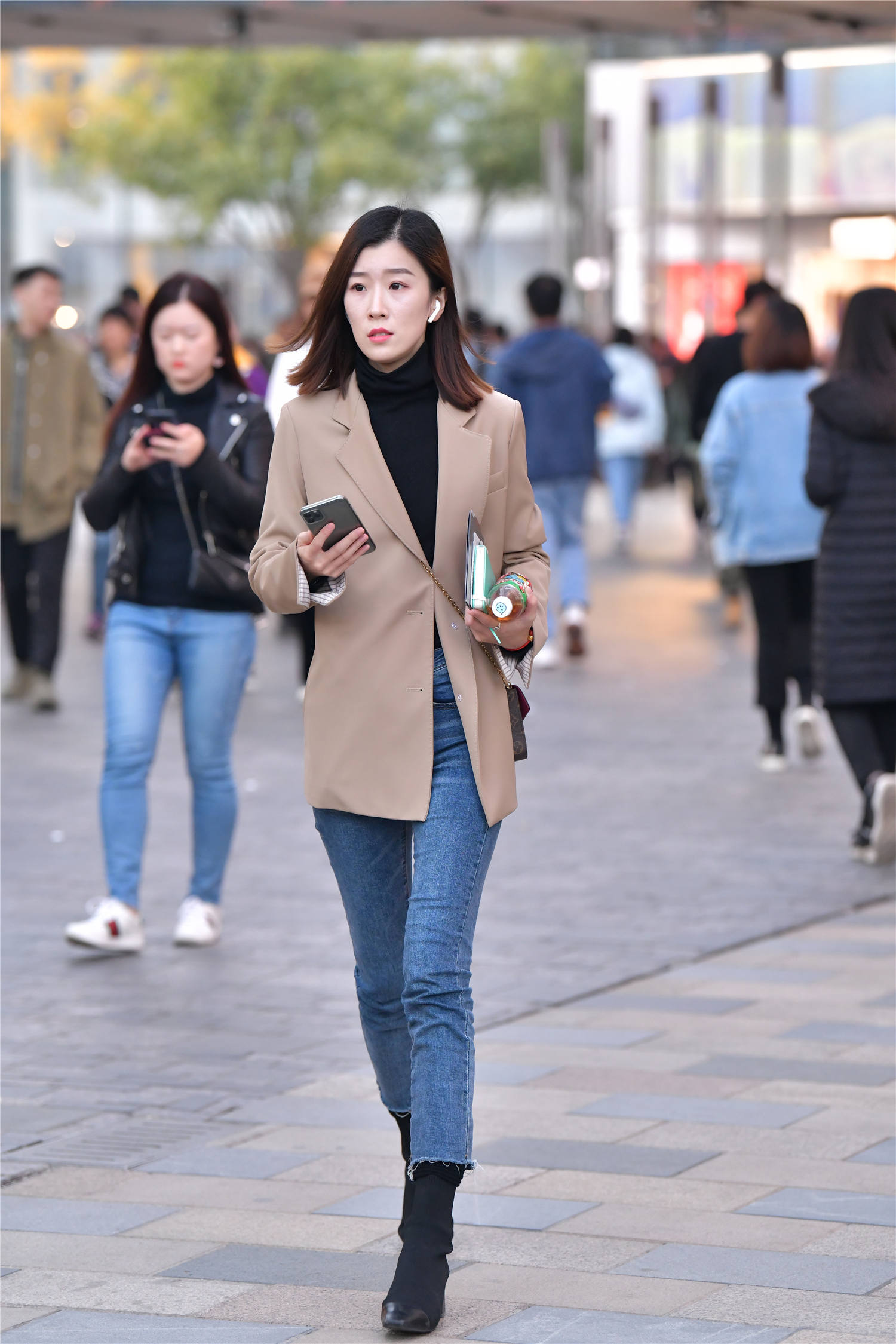到了秋天,选择高跟短靴,会更好的衬托身材,也会搭配出很有层次感,深秋时节的着装,还是要注意保暖的,看一下这位姑娘的穿搭,天蓝色的高腰牛仔裤,修身的款式,裤脚剪了一下,有着九分裤的效果,搭配一双高跟短靴,更好的衬托身材,一件杏色西服,内搭一件黑色高领小衫,有着一点混搭的效果。