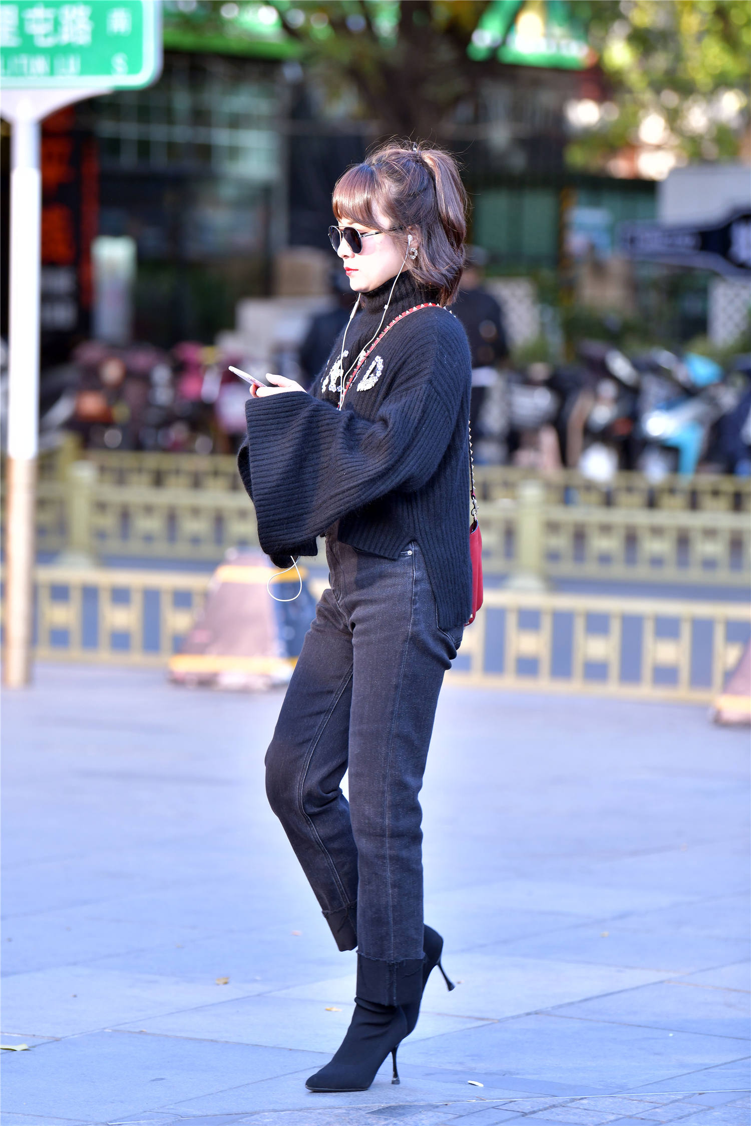 秋天里,很多人喜欢搭配黑色,但是搭配出层次感和质感,选择服装的时候,还是要多注意一些的,看一下这位姐姐的穿搭,一件高亮的针织毛衣,会有着保暖的效果,袖子特别肥大,这样会更有个性,衣襟侧面开叉,前面部分掖在深灰色牛仔裤里面,牛仔裤的裤脚挽起一点,这样露出脚下的尖头细跟袜靴,而这双靴子,更有修身的效果。