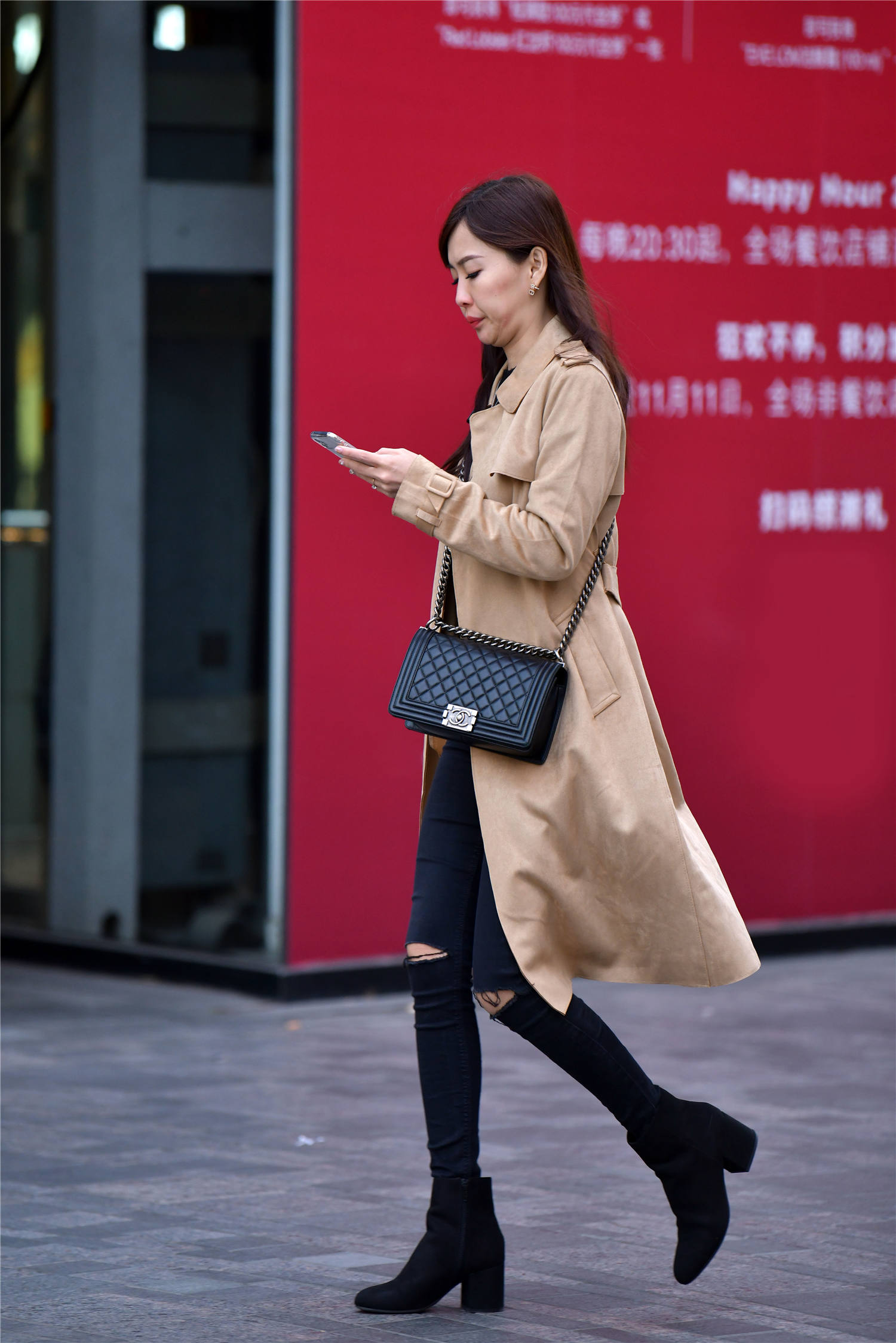 秋天要穿着保暖,风衣会搭配出很好看的效果,一款卡其色的风衣,增加色彩,还搭配出很时尚的感觉,黑色牛仔裤,膝盖处的破洞,增加个性,而且修身的设计,也展现出很纤瘦的效果,脚下穿着一双黑色粗跟短靴,这样一身搭配有着秋天的色彩,搭配也会变得很层次,秋天就要这么穿。