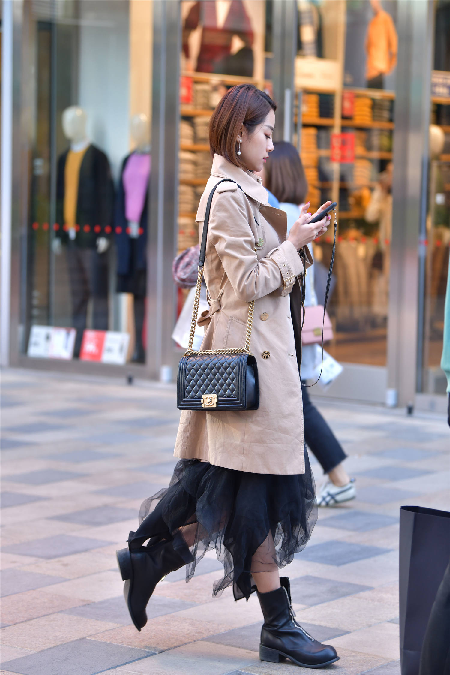 秋天的搭配,会很有层次感,也会搭配出很精致的味道,当然这个季节也会考验一个人的搭配水平,这件中长款式的风衣,浅色系会很好看,一件纱裙,层叠和褶皱都非常漂亮,看着简简单单的,却很有色彩,一双拉链的短靴,很经典的款式,也搭配出很简约的风格,一头扣发,更显精致。