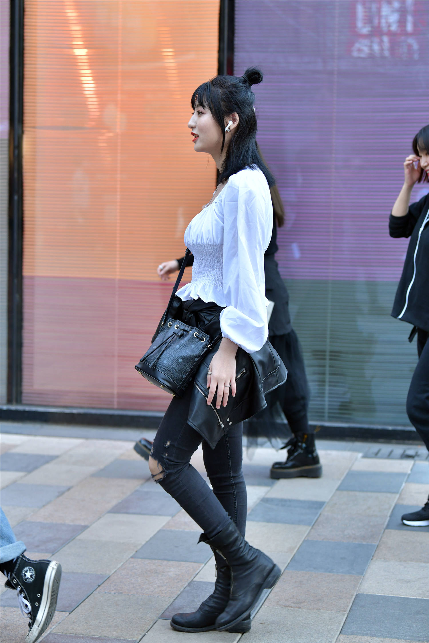 时尚的美女,会有着自己的搭配想法,到了秋天,要穿出自己的味道,展现出自己的时尚,一条黑色牛仔裤,秋天还要穿着破洞的款式,这样显得很有个性,白色衬衣,松紧的收腰设计,显得身材很好看,脚下穿着一双黑色短靴,平底款式会穿出小女生的效果,也展现出年轻的味道。