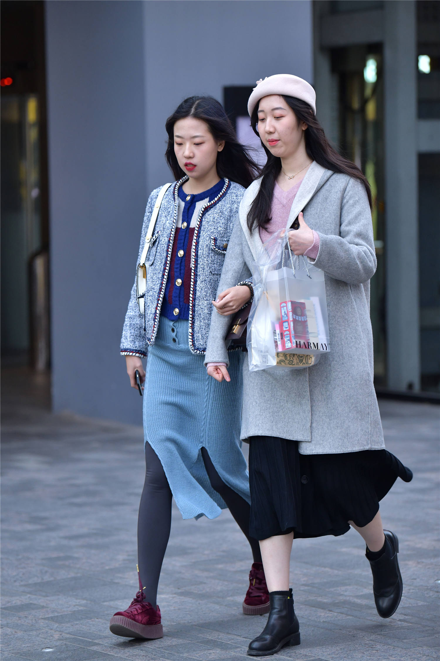 这是一对姐妹出来逛街,选择一双黑色皮靴,会非常有质感,而且秋季也会很保暖,一件高级灰的大衣,衬里是米白色,中长款,黑色的半身长裙露出来,这样有着叠穿的效果,而且不是很挑身材,搭配出很美的效果,头顶上的帽子,装饰作用很好,还有着不错的保暖效果,有着姐妹陪着逛街,会非常舒适。