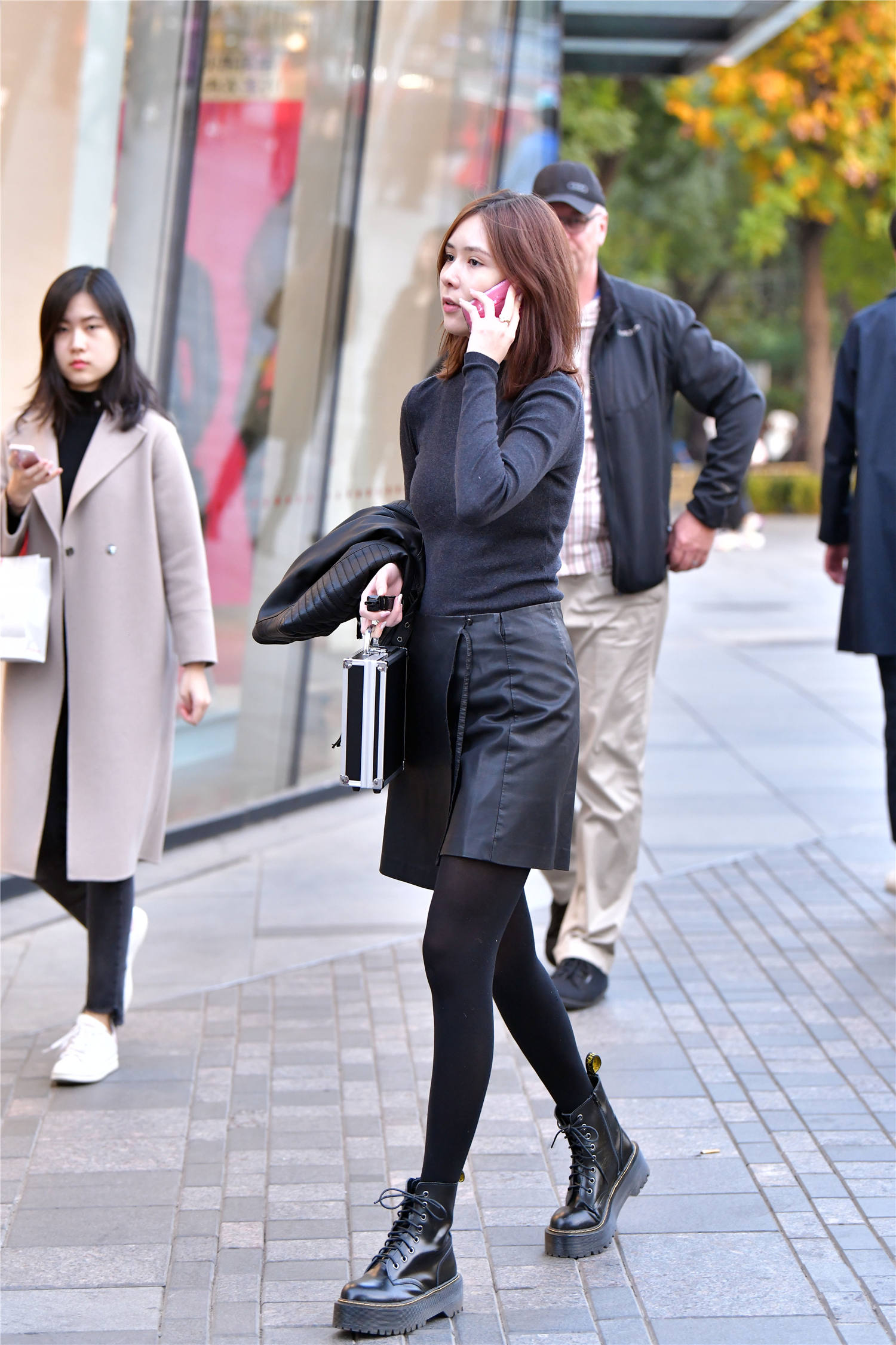 看一下这位美女的穿搭,非常单一的深色系,也是秋天常见的色彩,想要搭配出层次感,还要注意质感的选择,一件黑色的衬衣,有着修身的款式,搭配一条黑色皮质短裙,这样会非常有层次感,黑色打底裤搭配一双黑色马丁短靴,有点漆皮的效果,厚实的鞋底,也有着年轻和显身材的效果。
