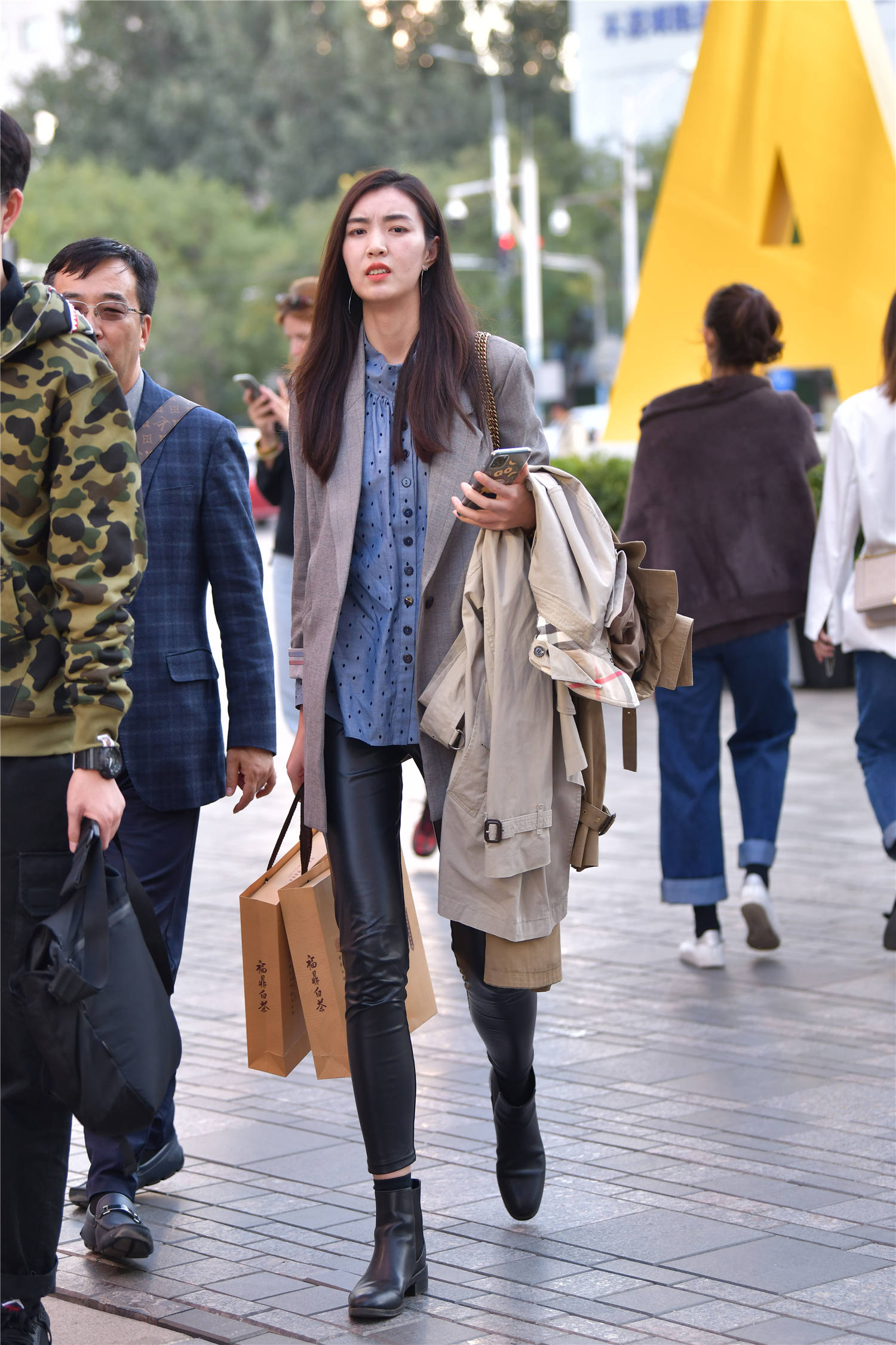 很多时尚的小姐姐,她们也很会搭配,穿出自己的味道,搭配出自己的时尚,而且身材高挑的姑娘,也更会搭配,穿出很美的效果,灰色西服搭配蓝色衬衫,衬衫扣子很多,看着很好看,一条黑色皮裤,修身的款式,搭配出很美的味道,脚下穿着一双黑色皮质短靴,平底的款式,休闲又简单,非常好看。