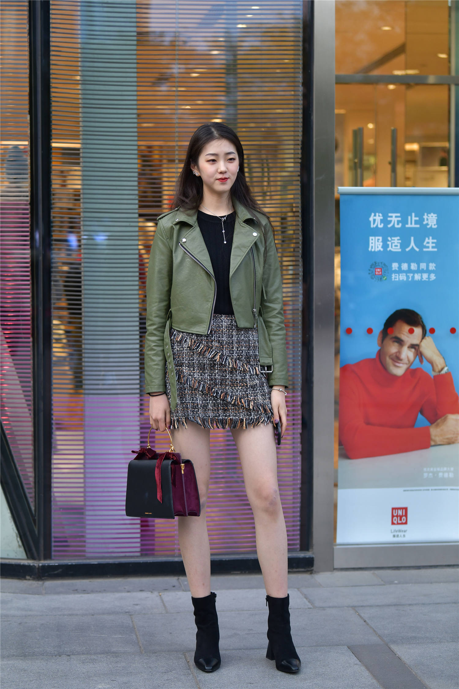 时尚的姑娘,在秋季穿搭,选择一款短靴,时尚有个性,一双黑色短靴,布面与皮质相结合,有着拼接的效果,粗呢编织的高腰裙,斜纹理的流苏设计,显得非常个性,也显出身材比例效果,一件黑色小衫,外面一件绿色的短衣襟皮夹克,腰带垂下来,更显休闲的效果,小姐姐这么搭配,非常好看,也展现出很时尚的效果。