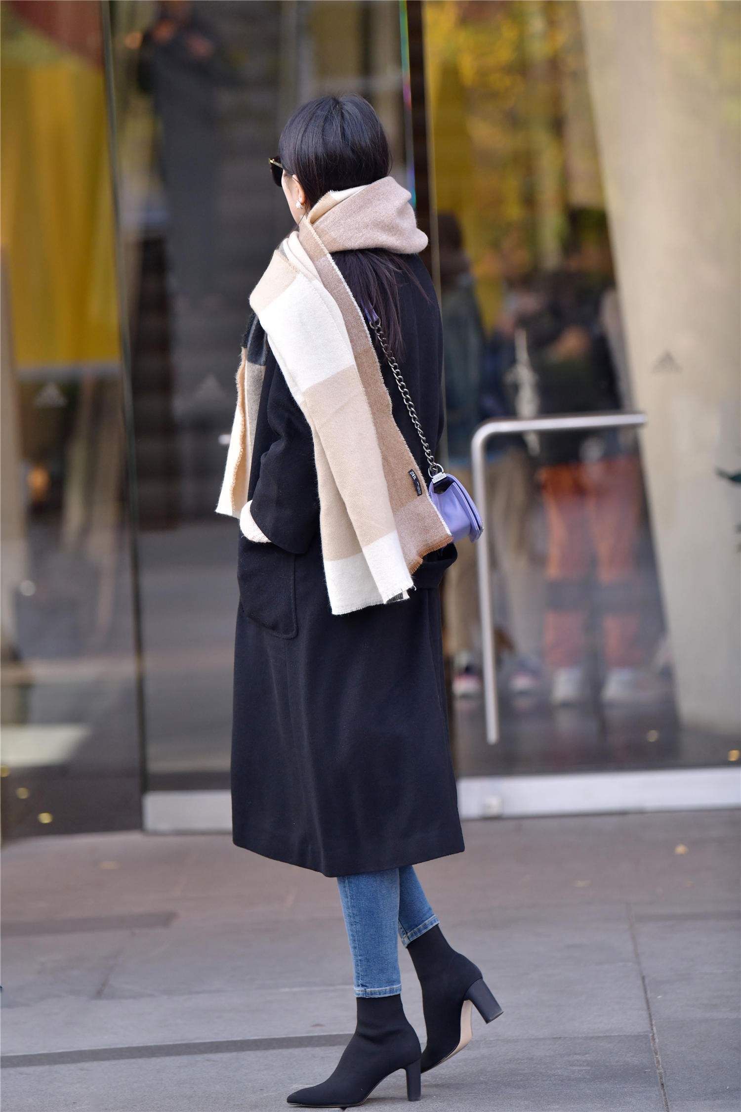 不同的大衣,展现出不一样的风格,这位美女选择一款黑色大衣,过膝长度,会显得非常保暖,一条浅色格子围巾,更有保暖效果,也搭配出初冬的味道,蓝色修身牛仔裤,裤脚到小腿位置,脚下的粗跟尖头袜靴,更好与牛仔裤相接,这样穿出很美的时尚味道,展现出很个性的效果来。