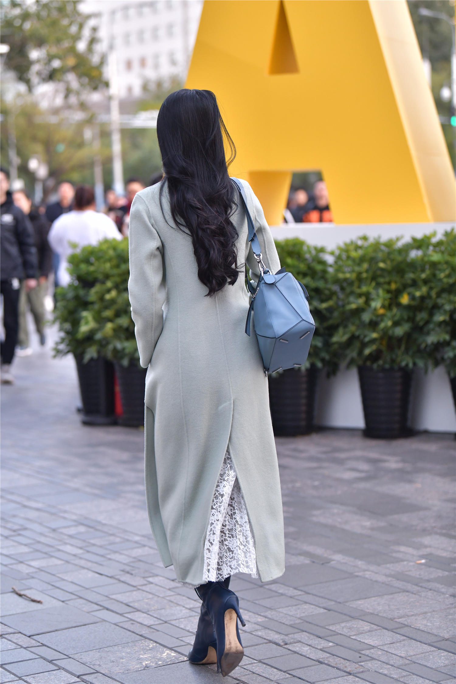 初冬时节的大衣搭配,时尚姑娘总会穿出自己的味道,选择色彩和款式,也会让你感觉大衣有很多种,还可以搭配出气质效果,这位美女选择一款青色大衣,有着一点冷色调的效果,大衣后面的开叉,露出里面的白色印花连衣裙,脚下一双尖头细跟短靴非常漂亮,也看出走路优雅的效果,一头长发飘在后面,看着自然,搭配出精致的感觉,冬天就要这样搭配,穿出气质,展现出风度。