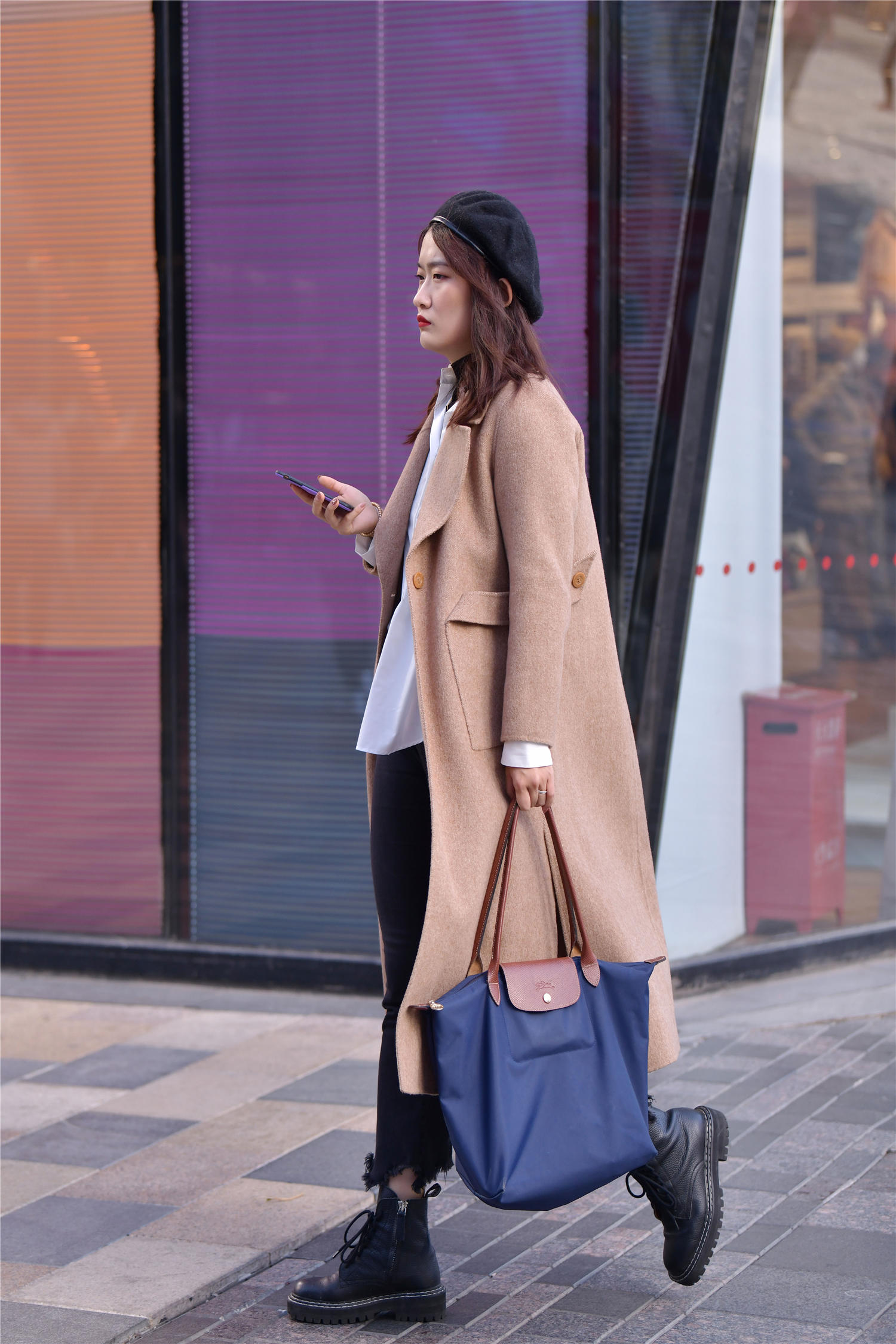 初冬时节,选择大衣,很多姑娘会选择不同的色彩,让搭配变得更加好看,这位美女选择一款驼色的羊绒大衣,冬天搭配暖色,会有着一点暖洋洋的效果,白色衬衣搭配黑色修身牛仔裤,简单的黑白色,不显单调,脚下一双系带马丁靴,好看又时尚,头顶上的黑色帽子,保暖还时尚。