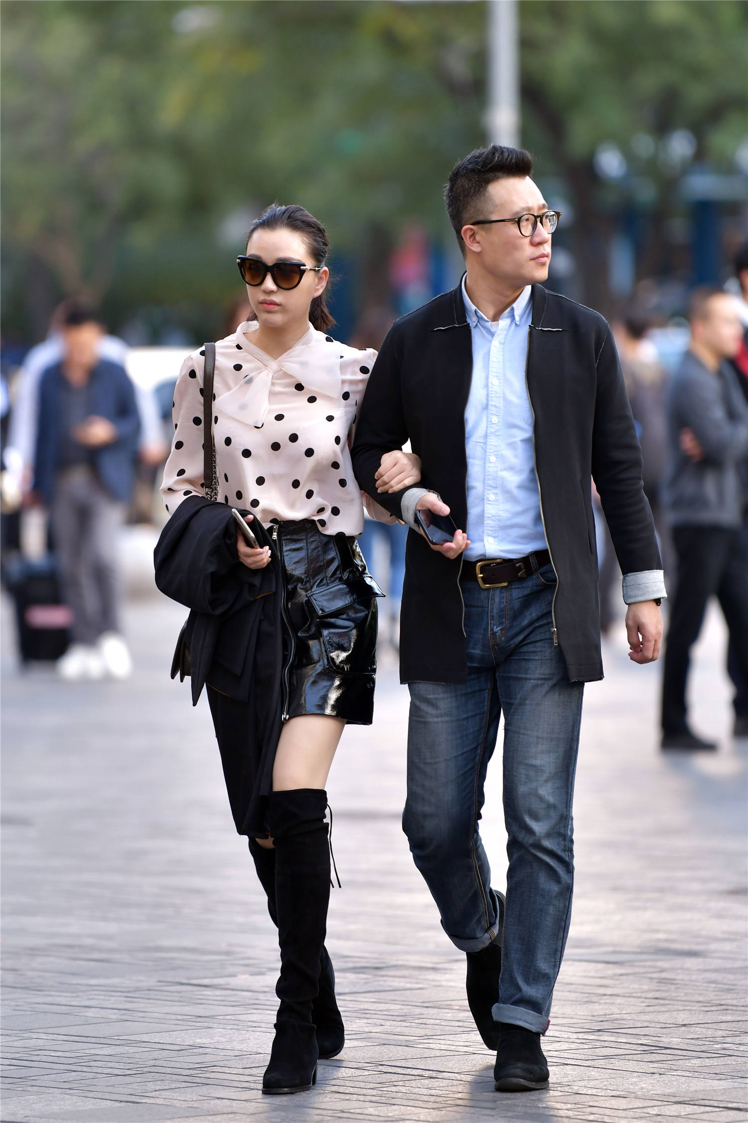初冬时节的搭配,要看你想穿出什么效果,展现什么风格,看一下这位美女,选择一款黑色绒面过膝长靴,黑色漆皮的高腰短裙,展示出很好的身材比例,而且也很有质感,一件米白色的衬衣,黑色斑点点缀,领口处的蝴蝶结,非常漂亮,臂弯里一件外套,冷了可以穿上,所以时尚姑娘要注意自己的搭配,还要保暖。