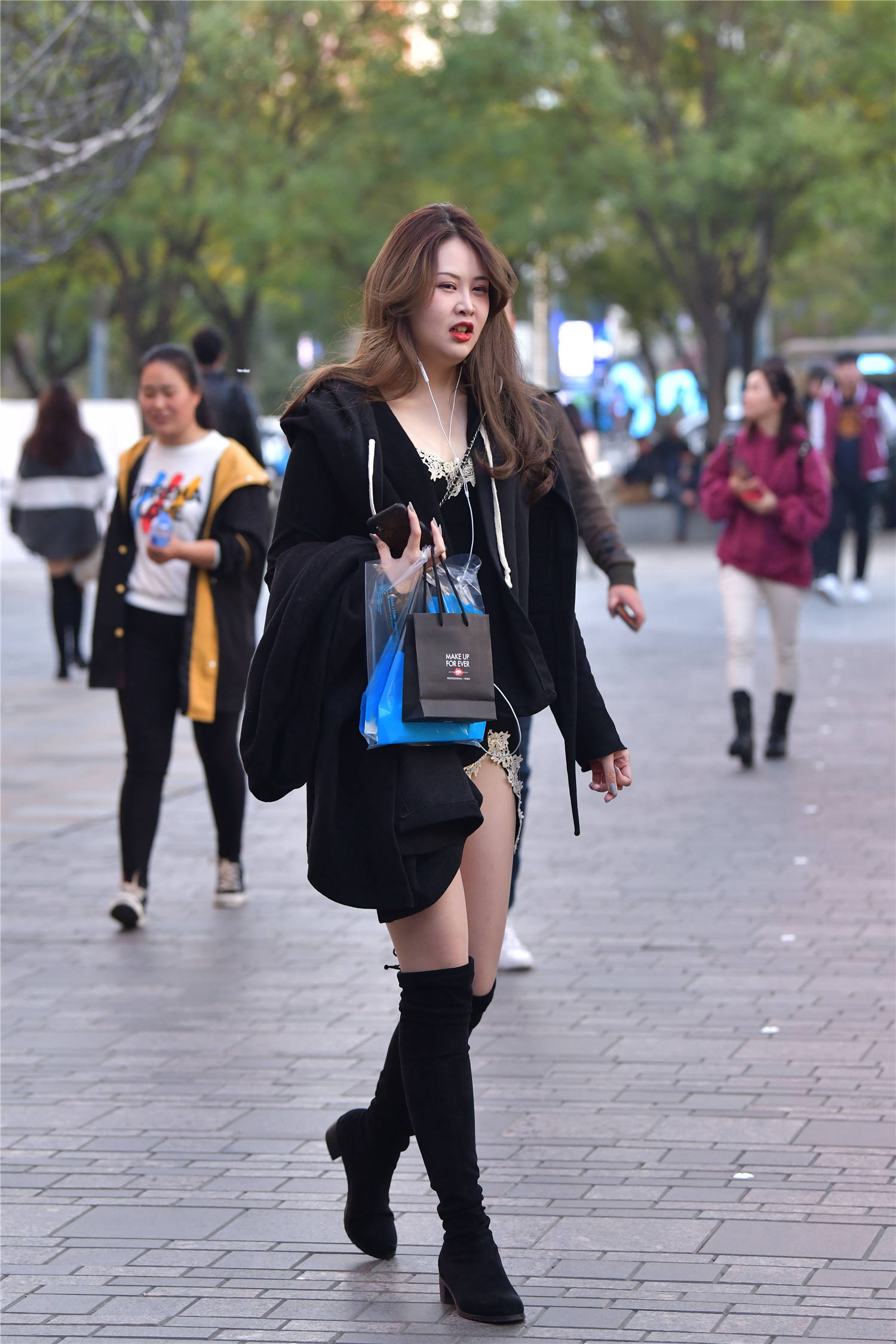 这位美女,很会搭配,也穿出秋冬世界的味道,黑色过膝长靴,鞋跟不高,逛街轻松不累,超薄的黑色丝袜,搭配出很简约的风格,也衬托身材,黑色连衣裙,白色蕾丝边,还有斜着的开叉设计,更好的展现身材,外面一件黑色短款外套,搭配出很美的效果,这就是黑色搭配,要有层次,也适合冬季搭配。