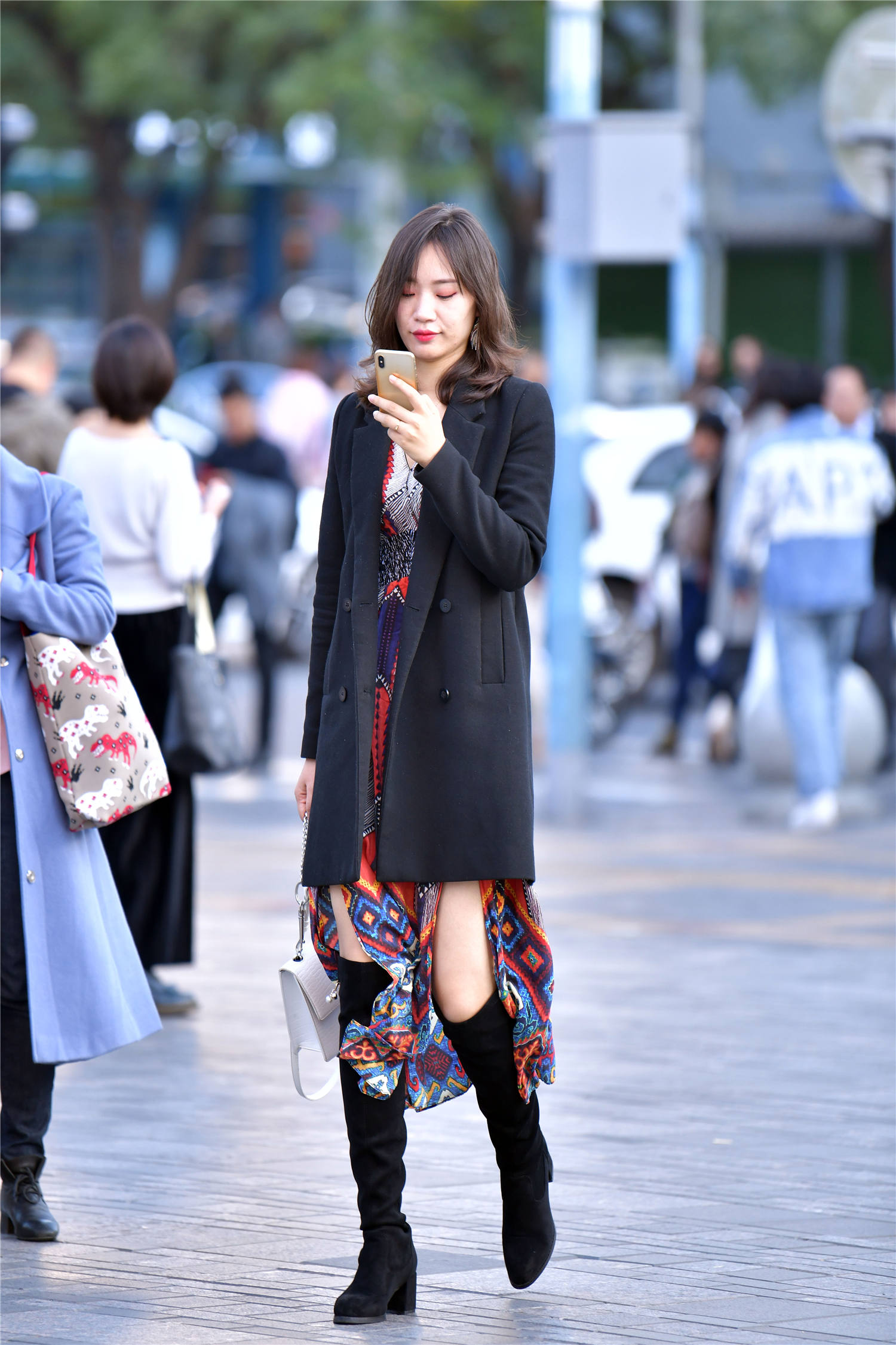 身材高挑的姑娘,会穿出自己的味道,展现出自己的气质,初冬时节,要穿着高筒靴,黑色的绒面,会有着很保暖的效果,露出一点大腿,让你感觉很好看,一件印花的连衣裙,非常个性的色彩,外面一件黑色大衣,没有系扣,简单时尚,还很好看,搭配出精致的效果,身材高挑的姑娘,穿搭变得简单,也搭配出自己的时尚感觉。