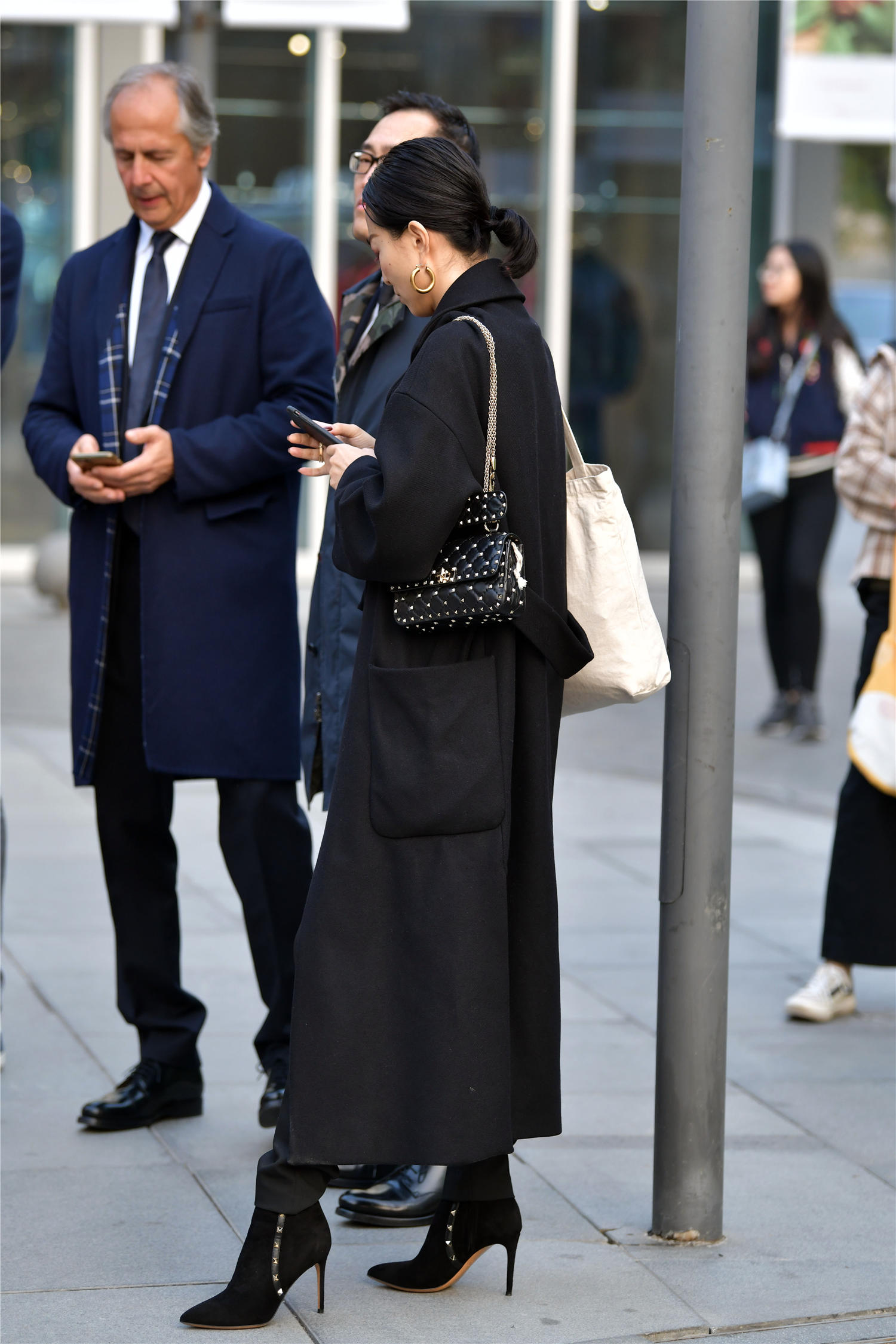 冬季的搭配,要注意保暖,而黑色又是冬季的色彩,很多人喜欢穿着黑色,简单容易搭配,看一下这位姐姐,选择一款黑色短靴,尖头细跟的款式,非常简约,衬托身材的苗条,有着显瘦的效果,侧面的金属铆钉带,很好看,增加装饰,还很有层次感,一件长款的黑色呢子大衣,刚好到脚踝位置,更好衬托她的身材。