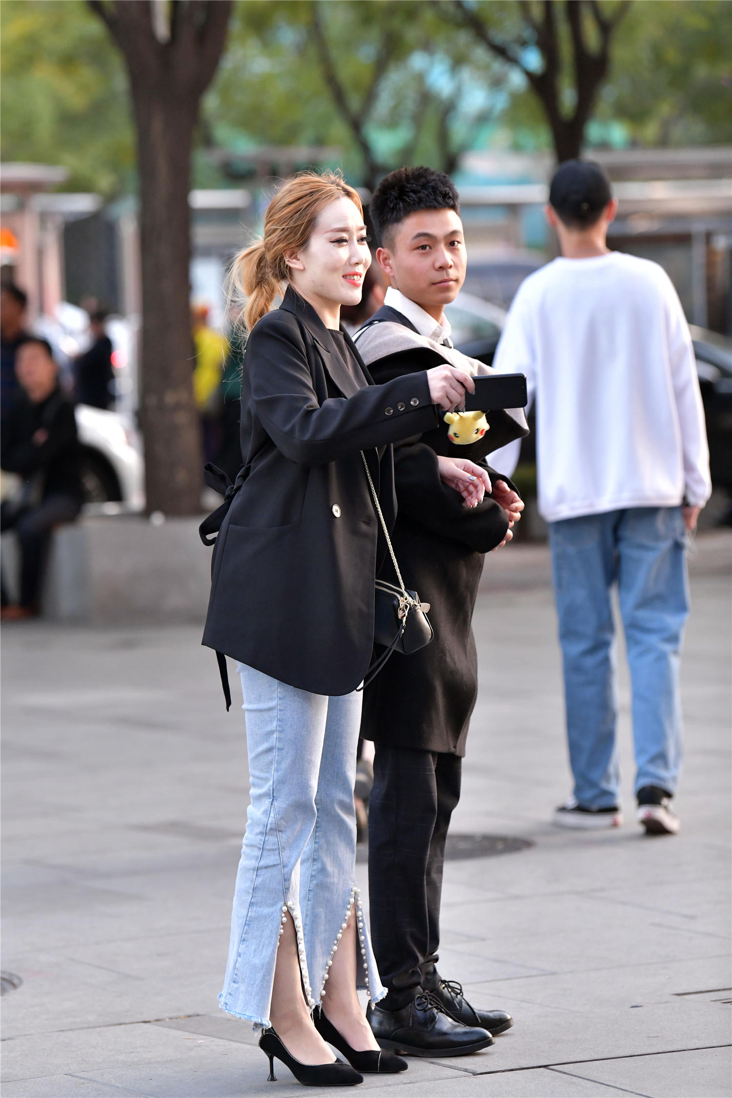 到了冬天,会搭配的姑娘,依旧会搭配出简约风格,她们喜欢展示自己,不会穿出臃肿的效果,而且要穿着高跟鞋,来衬托自己,看一下这位小姐姐,她选择黑色西装,简单又好看,搭配浅蓝色牛仔裤,很经典的混搭风,裤脚到脚踝的位置,还有一个开叉,用珍珠来装饰边缘,非常好看,一双黑色尖头细跟单鞋,鞋跟不高,却很好衬托身材。