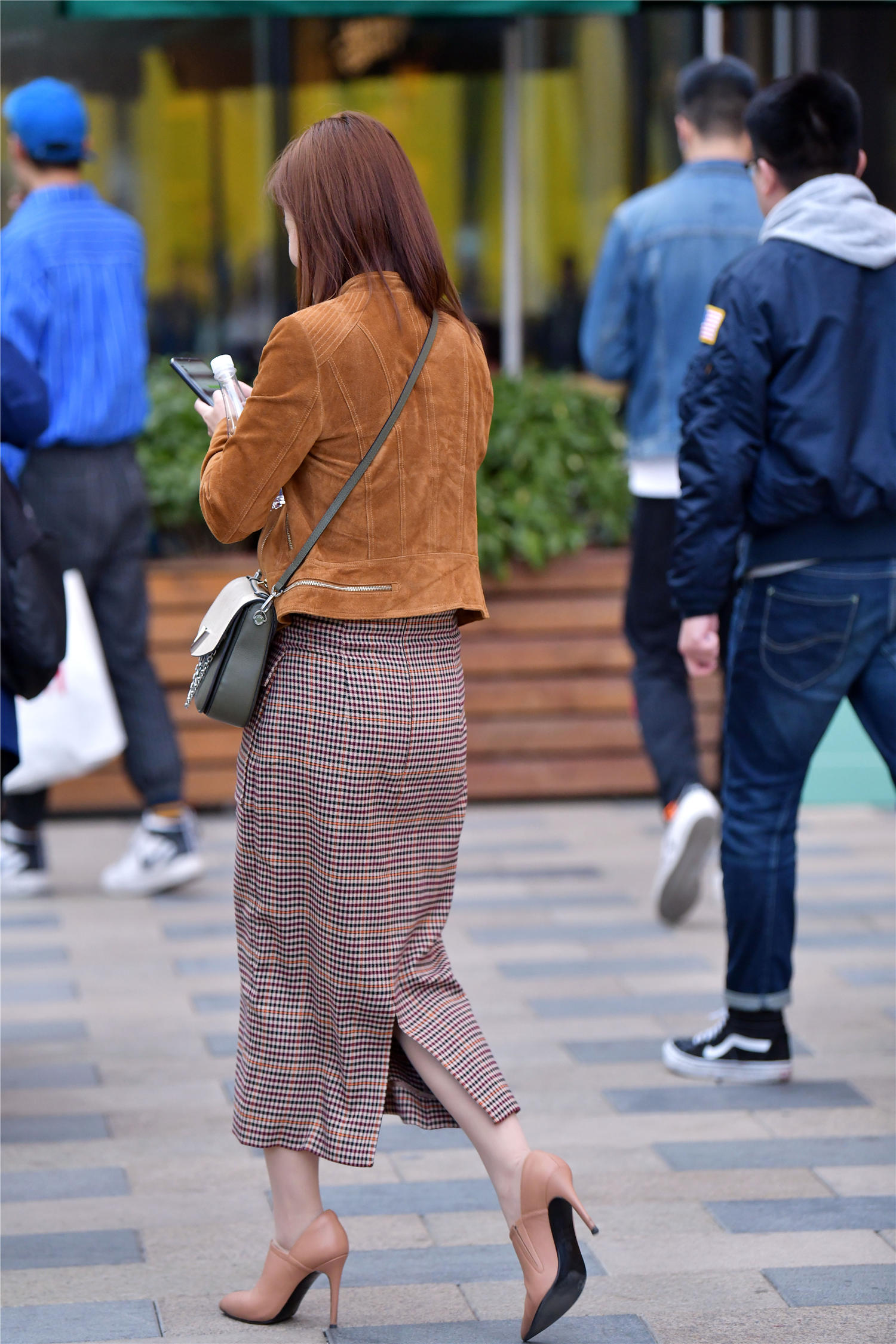转眼间到了冬季,北方的冬天,也变得有些冷,在这个时节的时尚姑娘如何搭配自己呢?逛街选择一双高跟鞋,还要起到保暖和时尚效果,先看一下这位身材微胖的姑娘搭配,高腰条格的筒裙,很长的裙摆,过了小腿肚的位置,后面一个开叉,脚下穿着一双尖头细跟踝靴,衬托身材高挑,一件棕色的短衣襟皮夹克,更好展示身材比例效果。