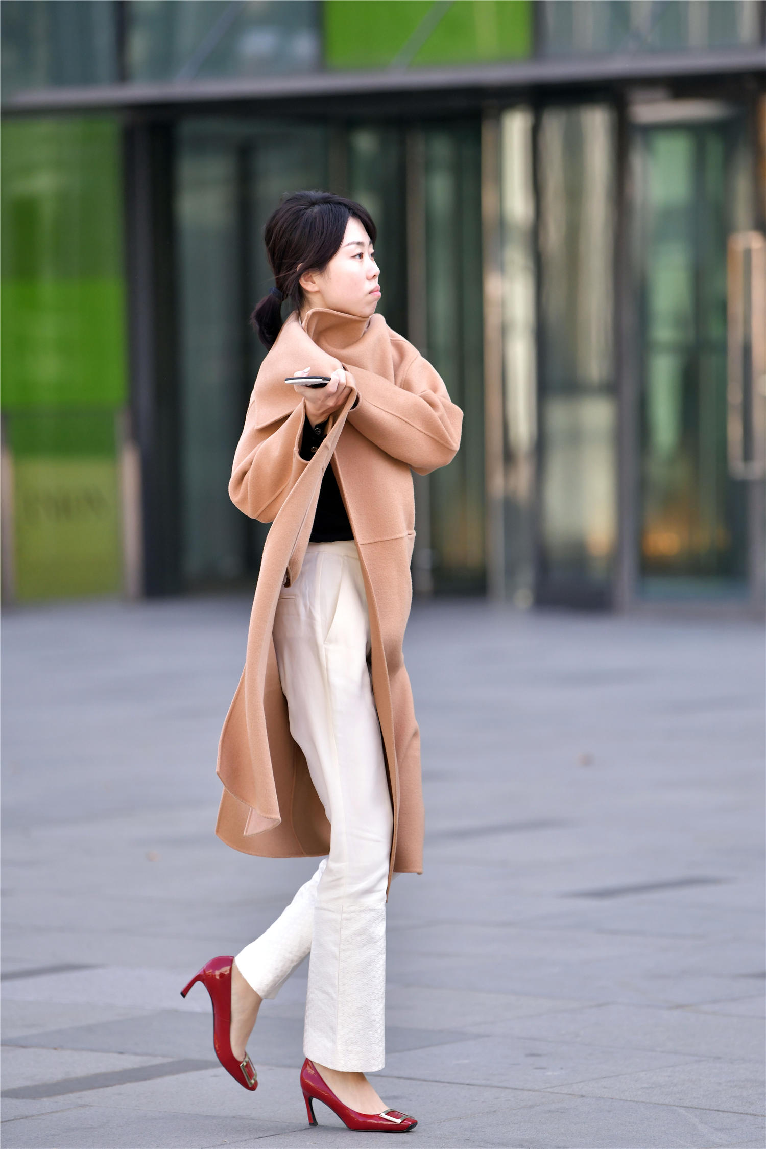 冬天的色彩,也可以搭配暖色服装,一款藕荷色的呢子大衣,过膝的长度,很好看,搭配白色高腰长裤,更好的展示身材比例效果,脚下一双红色高跟鞋,鞋跟有着弧度,显得很个性,浅口的设计,露出一点脚面,鞋尖的方扣设计,增加装饰效果,一身简单的暖色搭配,还有着靓丽的感觉,冬天这样的色彩也很好看。