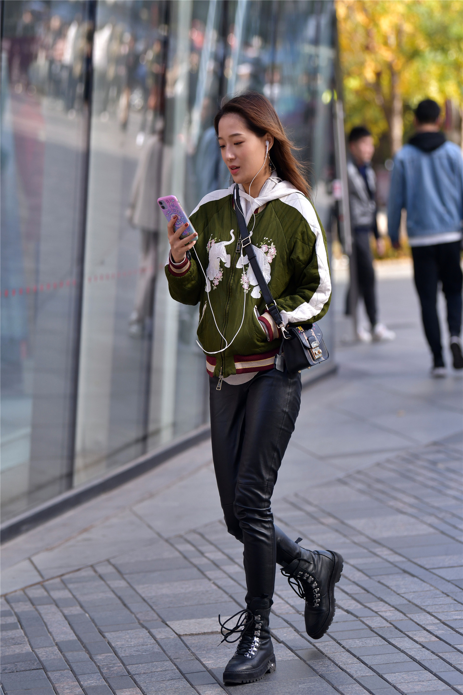 对于很多时尚姑娘来说,到时尚街区逛街,会选择一双马丁短靴,好看有很时尚,让搭配更有层次感,也有更多的搭配空间,看一下这位美女的穿搭,一条黑色修身的皮裤搭配一双黑色系带的马丁短靴,简单都非常好看,墨绿色与白色的拼接帽衫,感觉冬天这样搭配皮,有色彩,还很保暖的感觉。
