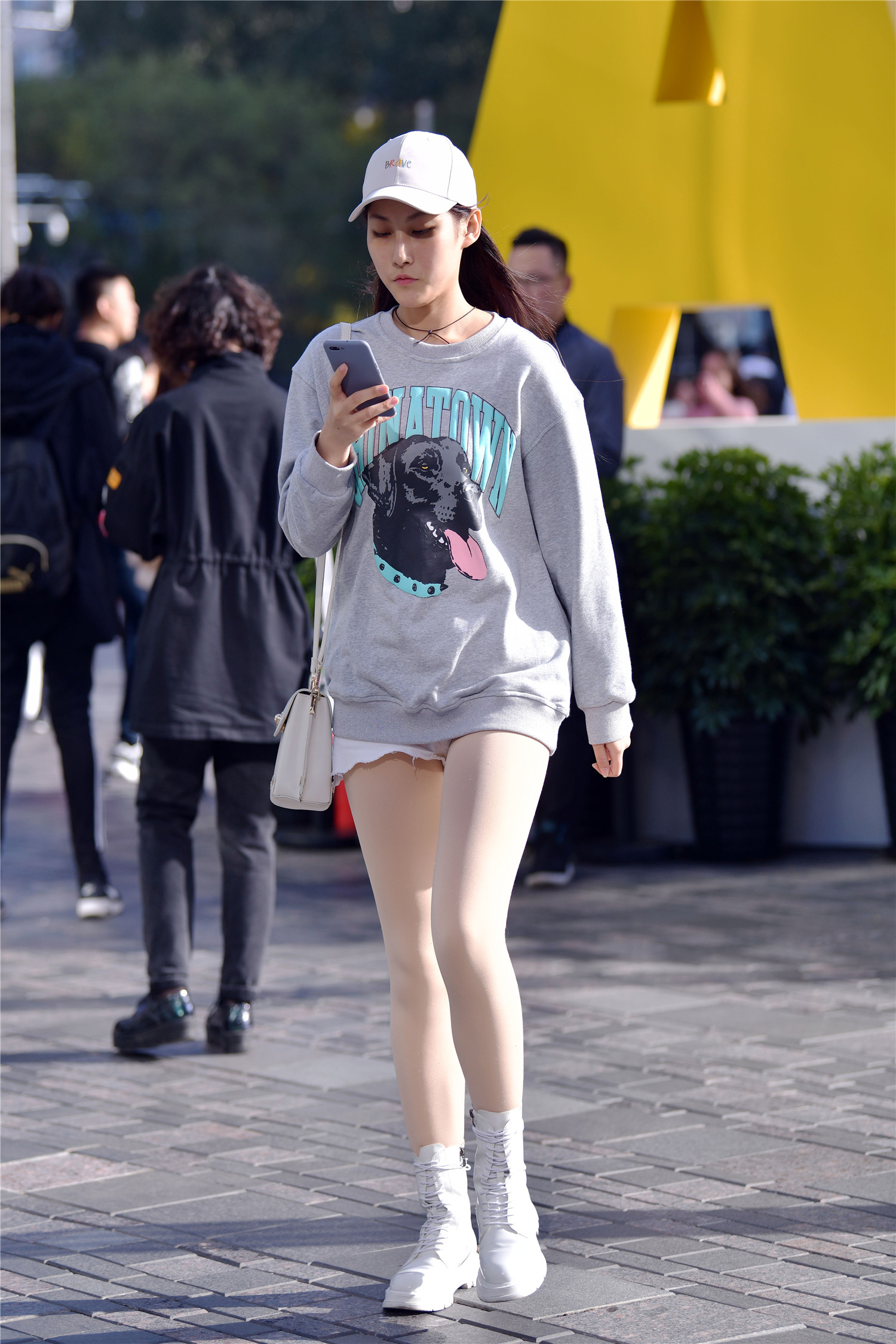 每一位时尚姑娘,她们喜欢的风格不一样,也会搭配出不同的效果,这位小姐姐喜欢浅色系,一双白色系带马丁靴,平底款式逛街会更舒服,白色打底裤,非常修身的效果,一条白色牛仔短裤,搭配出很精致的感觉,浅灰色的卫衣,穿出简约的风格,一顶鸭舌帽,简单又很好看,一身搭配还展现出自己的身材。
