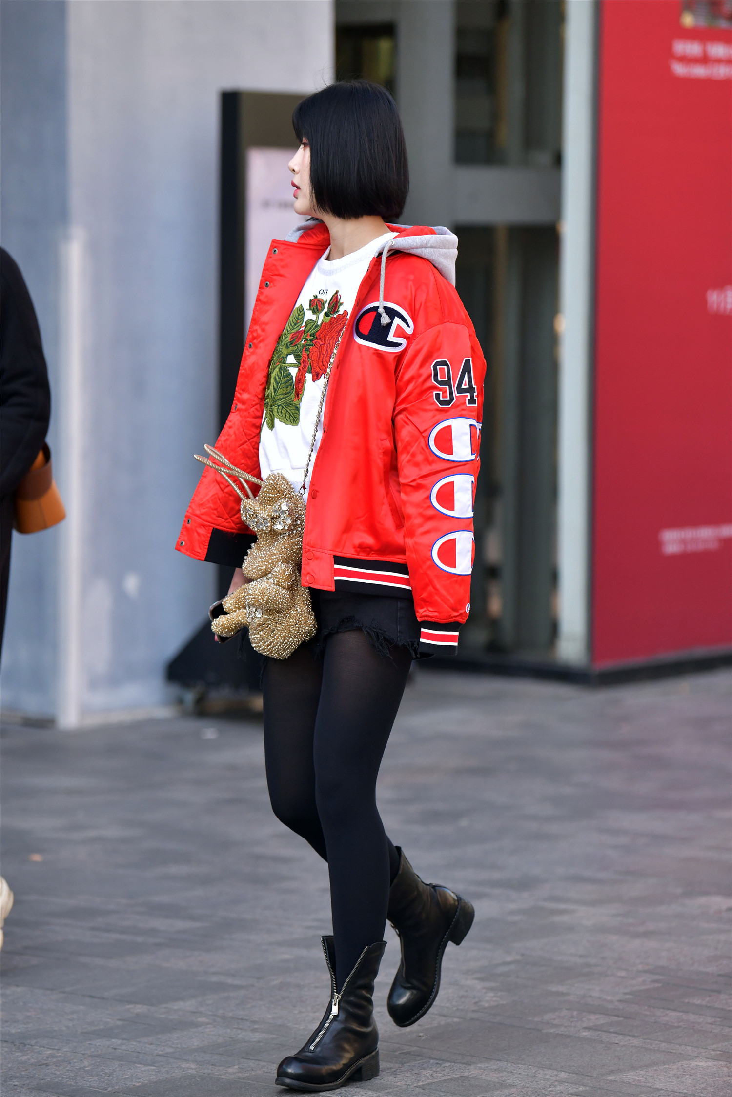 拉链马丁靴,是很简单的款式,也是容易搭配的,设计简单,中间一条拉链,增加装饰效果,受到很多小姐姐的喜欢,搭配黑色厚实的丝袜,修身显瘦,还衬托身材,搭配一条黑色毛边牛仔短裤,简单又好看,白色的圆领小衫,外面一件短款棉夹克,红色款式,增加色彩,红色也搭配出喜庆的感觉,这样搭配非常有层次感,也有色彩。