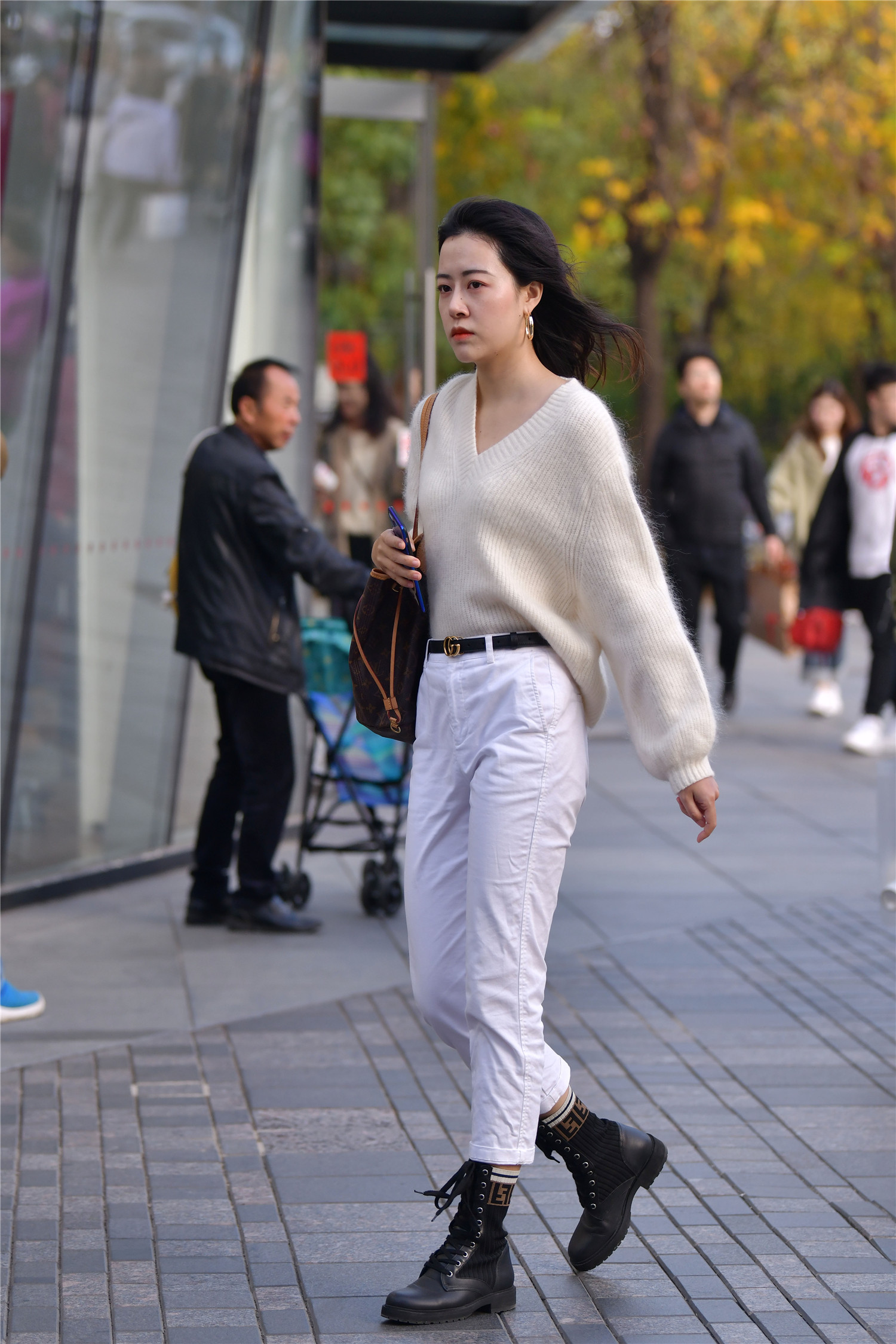 马丁靴有着百搭的效果,而且穿搭方便,很容易展示自己,所以受到很多年轻姑娘的喜欢,看一下这位小姐姐的穿搭,一双黑色系带马丁靴,还有着松紧的袜装设计,起到修身的效果,一条白色长裤,搭配黑色细腰带,裤脚刚好和马丁靴相接,显得身材比例很好看,米白色的羊毛衫,看起来毛绒绒的,还很保暖。