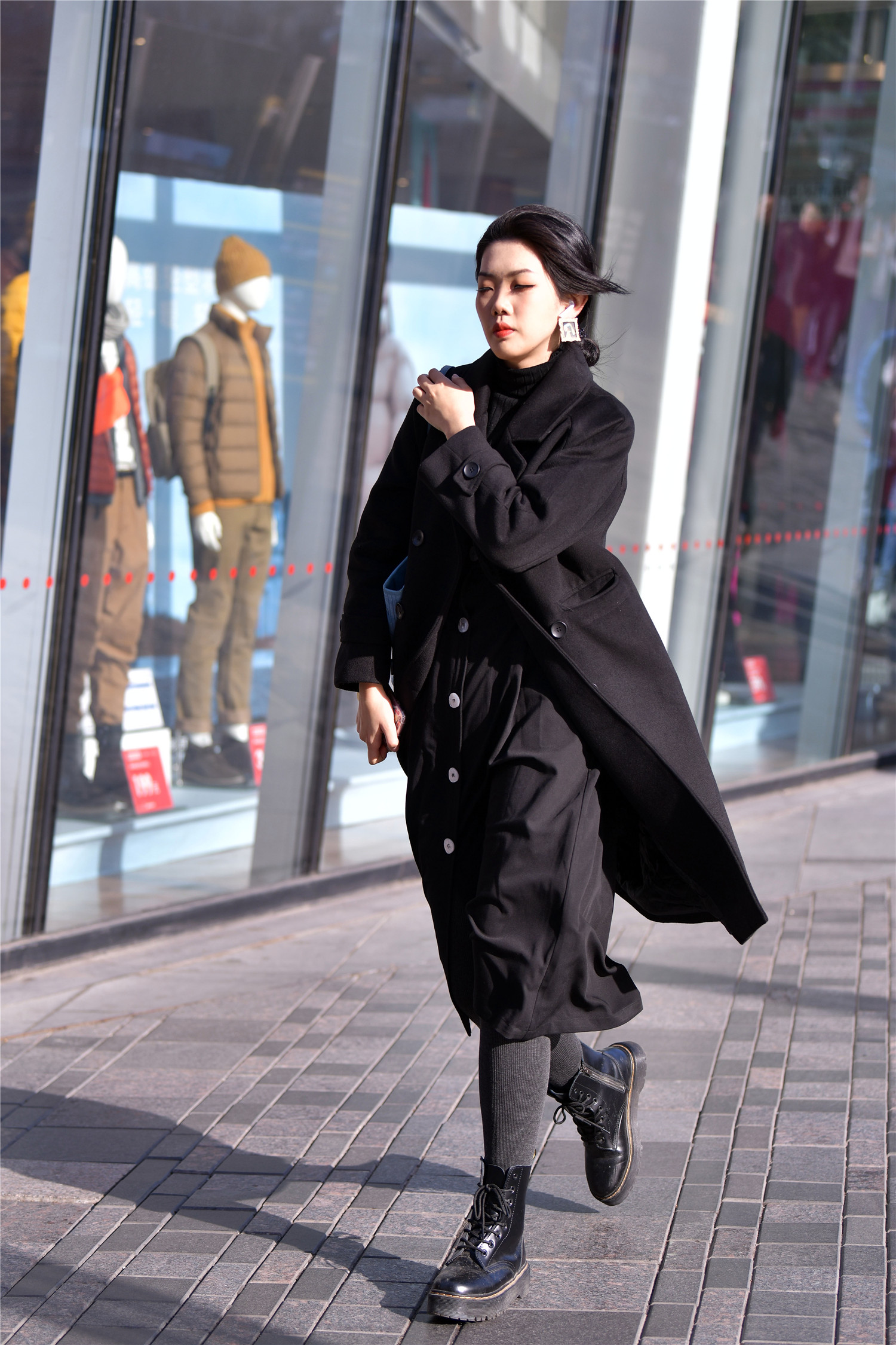 冬天的色彩,对于每一位小姐姐来说,都会不一样,选择自己喜欢的色彩,很重要,一件黑色风衣,内搭是系扣的黑色长裙,深灰色的打底裤搭配一双系带马丁靴,漆皮的效果,非常靓丽,也衬托人很好看,姑娘这一身深色系的搭配,有着冬天的搭配效果,而且还非常有层次感,穿出自己的味道。