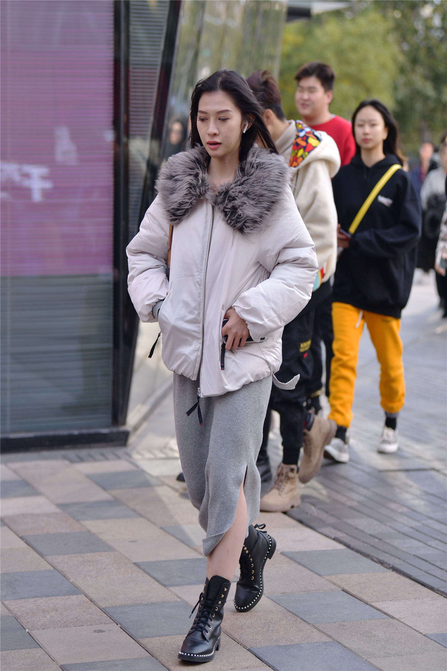 好看的马丁靴,会搭配出很美的效果,很多小姐姐喜欢这样搭配,看一下这位美女,选择一双黑色马丁系带短靴,鞋底边缘的小珍珠装饰,非常好看,让靴子更有层次感,而且黑色的皮质,非常有质感,穿着也很舒适,灰色长裙,也很好看,还有着百搭显瘦的效果,一件短款的棉服,又会起到很不错的保暖效果。