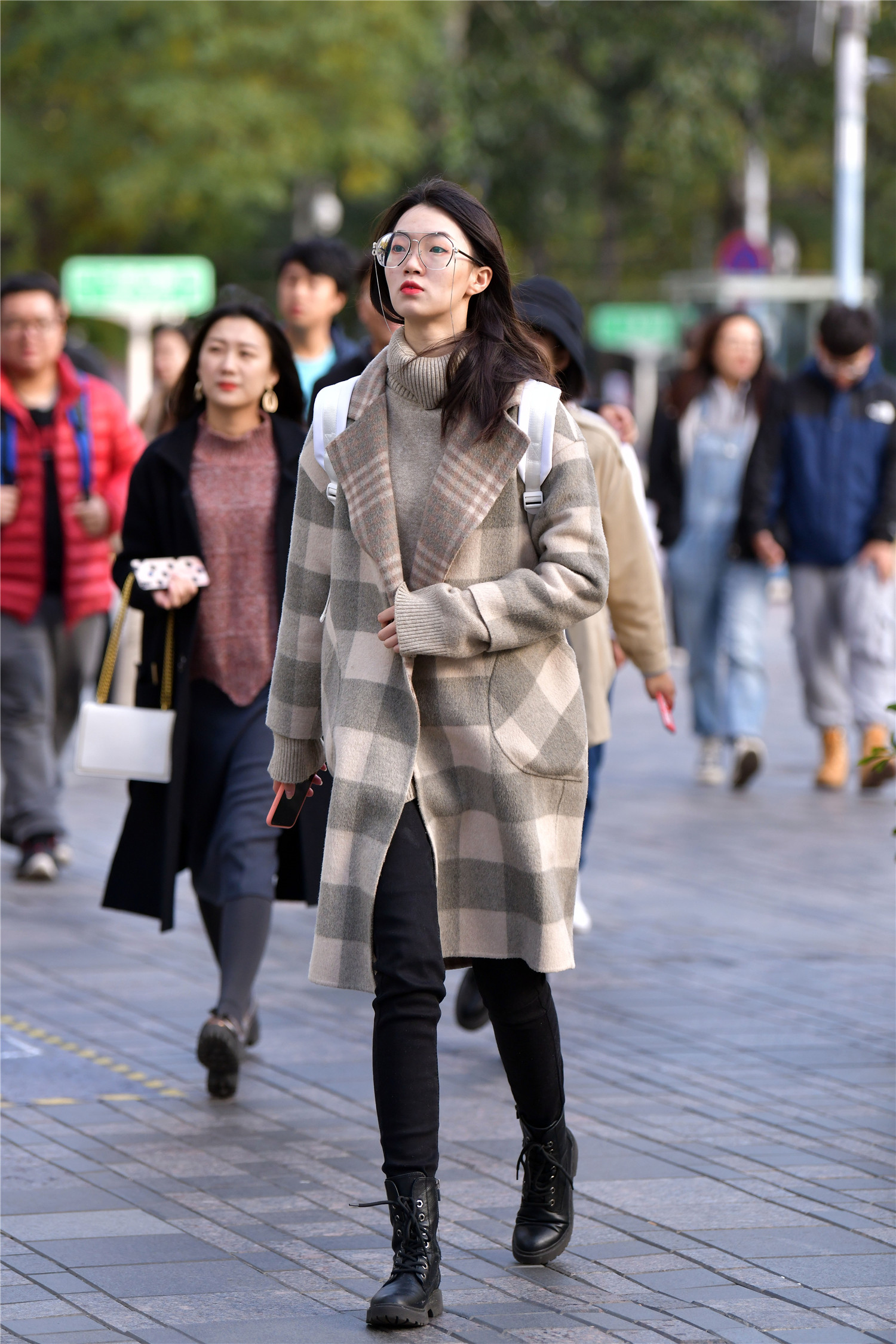 到了冬天,周末的时候,出来逛街的人还是很多的,而且时尚姑娘也会注意保暖的穿搭,脚下一双马丁靴,会让你的脚下不是很冷,黑色修身的牛仔裤,这样也会起到很不错的保暖效果,又衬托身材的苗条,灰色高领针织毛衣,保暖的效果很好,一件灰色方格呢子大衣,休闲的款式,逛街穿着保暖还很时尚。