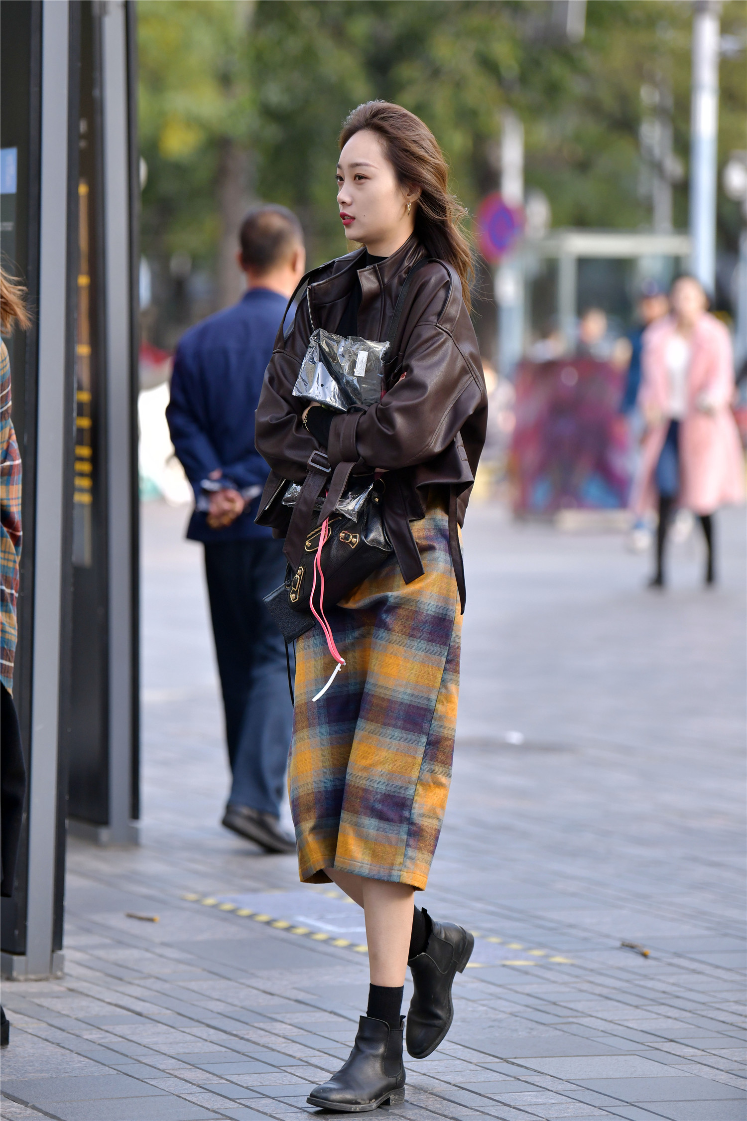 精致的姑娘,会搭配出自己想要的效果,而且她们也不怕冷,看一下这位小姐姐的穿搭,平底短靴,简单好看,袜子要高出靴筒一点,这样会更有层次感,也有着显瘦的效果,渐变色的长筒裙,增加色彩,黑色内搭外面一件皮夹克,非常有质感的穿搭,也展示出身材比例的效果,这一身搭配简单又很好看。