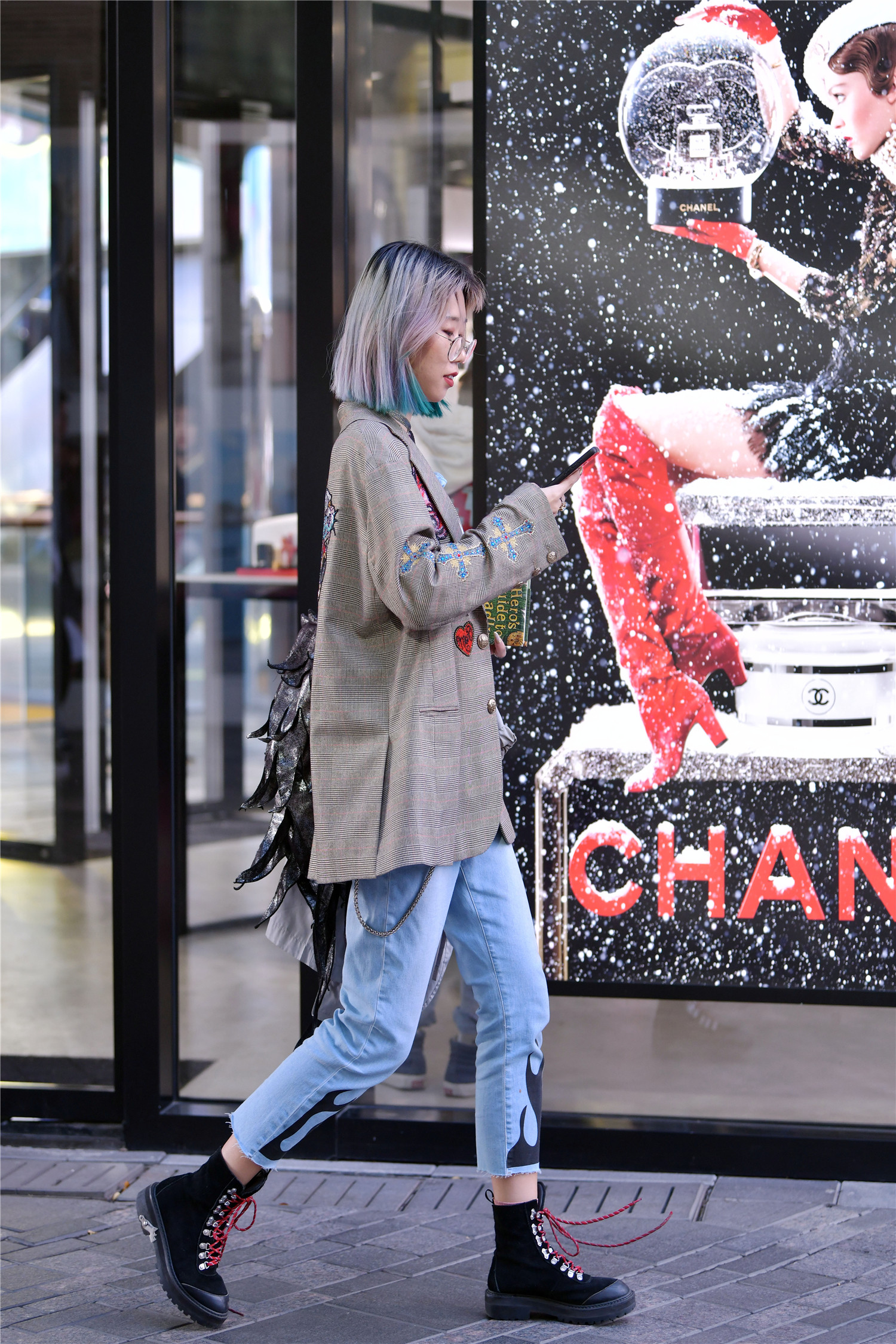 生活中很多会搭配的姑娘,她们选择简约的服装,穿出自己想要的效果,看一下这位小姐姐,一双系带的短靴,黑色鞋面,红色鞋带,非常好看的色彩,浅蓝色的七分牛仔裤,与短靴之间露出一点小腿,非常好看,一件长款的灰色格子西服,大码的款式,有着混搭的效果,头发染成渐变的色彩,看起来很有意思。