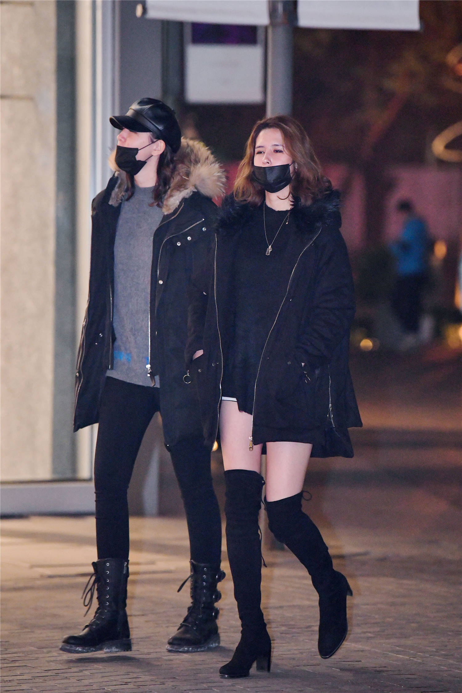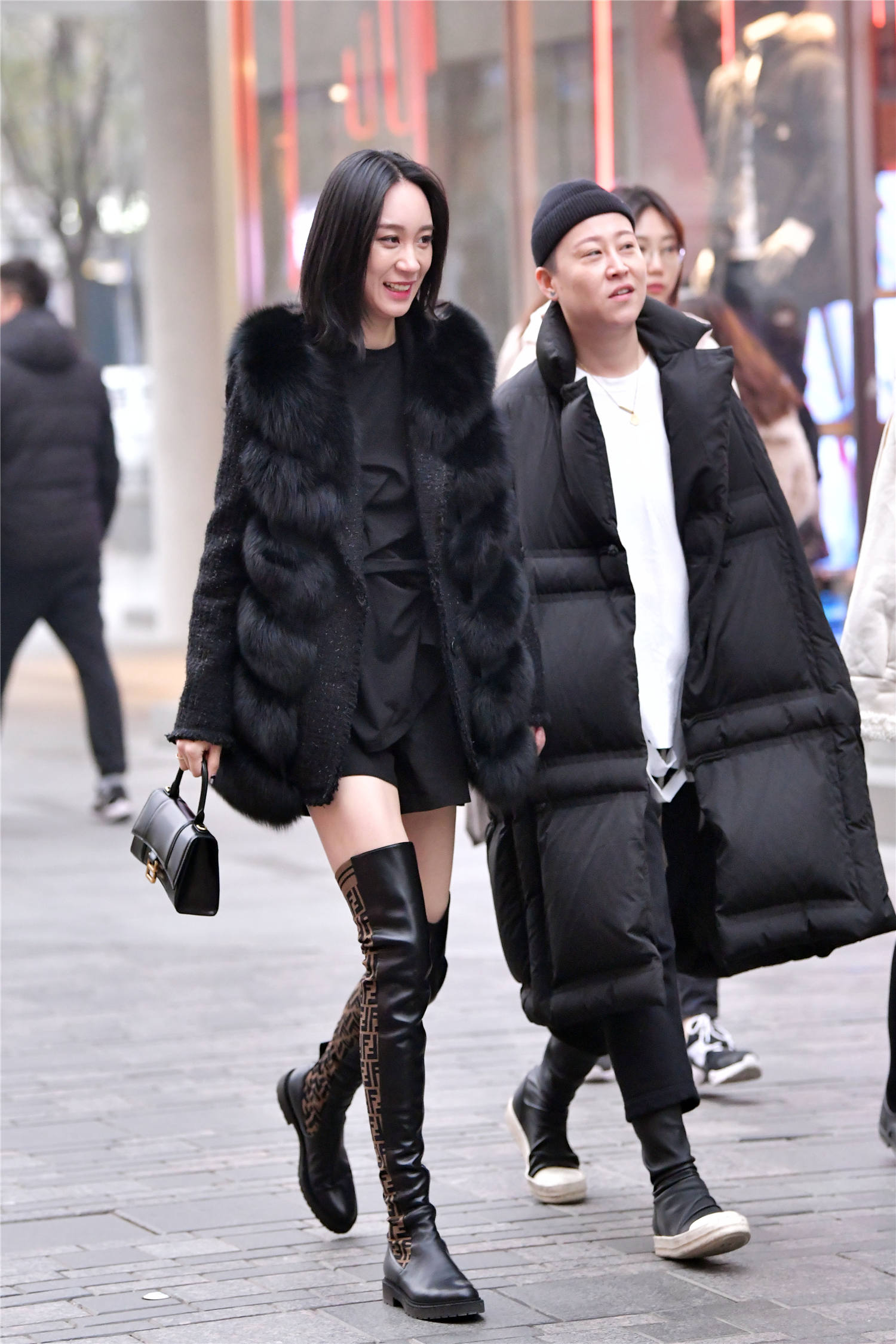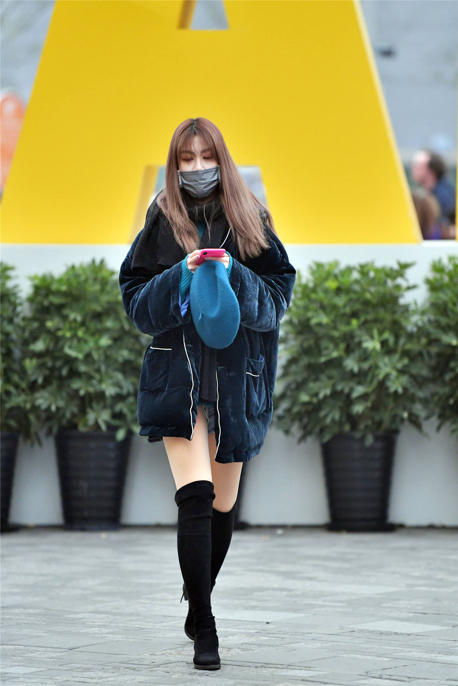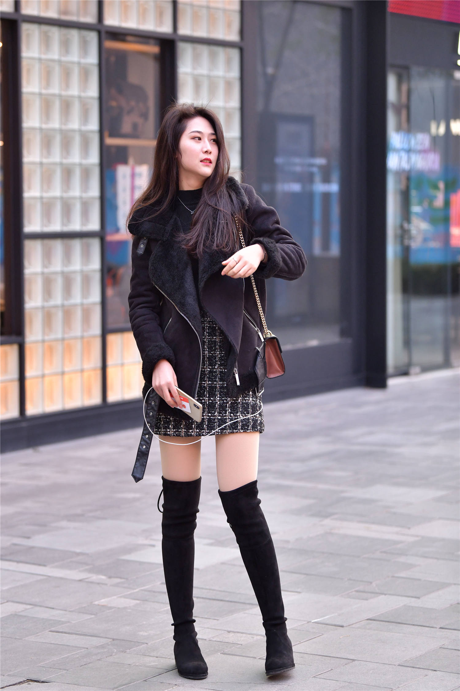 时尚街区也会有很多不怕冷的小姐姐,她们到了冬天依旧要展示一下自己,看一下这位美女,选择一款绒面的过膝靴,其实这款靴子里面有加绒,所以穿着也会很暖和,粗跟的款式,更好衬托匀称身材,上身黑色小衫,露出一点大腿,就很好展示自己不怕冷,外面一件黑色的棉夹克,简单又很好看。