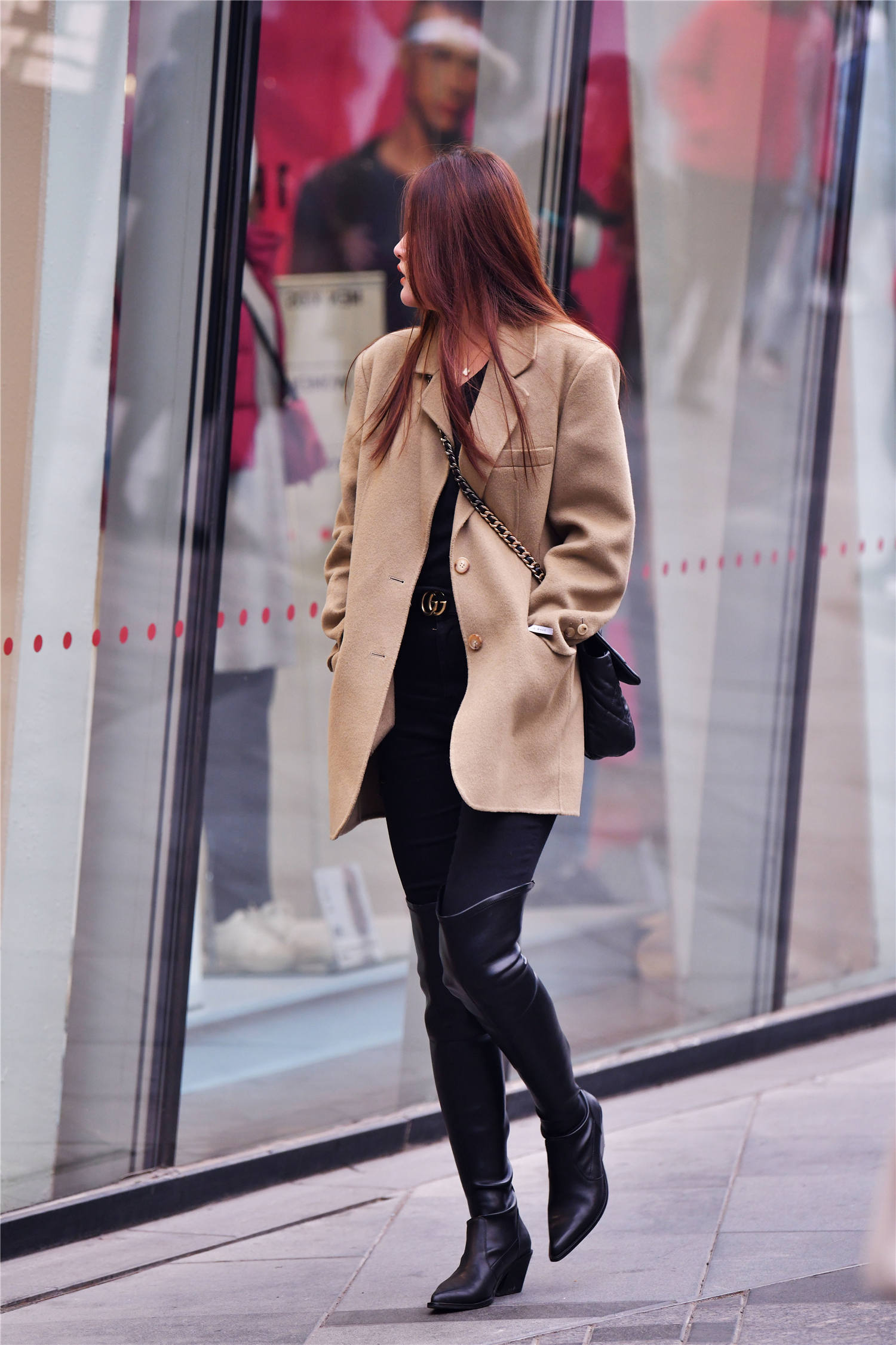 冬天穿搭,还是注意保暖的好,要穿出自己的味道,还要展现出时尚效果,生活中有很多会搭配的姑娘,也会更好地展示自己,这位美女选择一双黑色真皮过膝长靴,非常有质感的皮靴,带着一个坡跟,尖头的款式,有着显瘦的效果,黑色的紧身牛仔裤,更有着保暖的效果,搭配一件驼色的休闲短款大衣,冬天这么搭配逛街,也不会很冷。