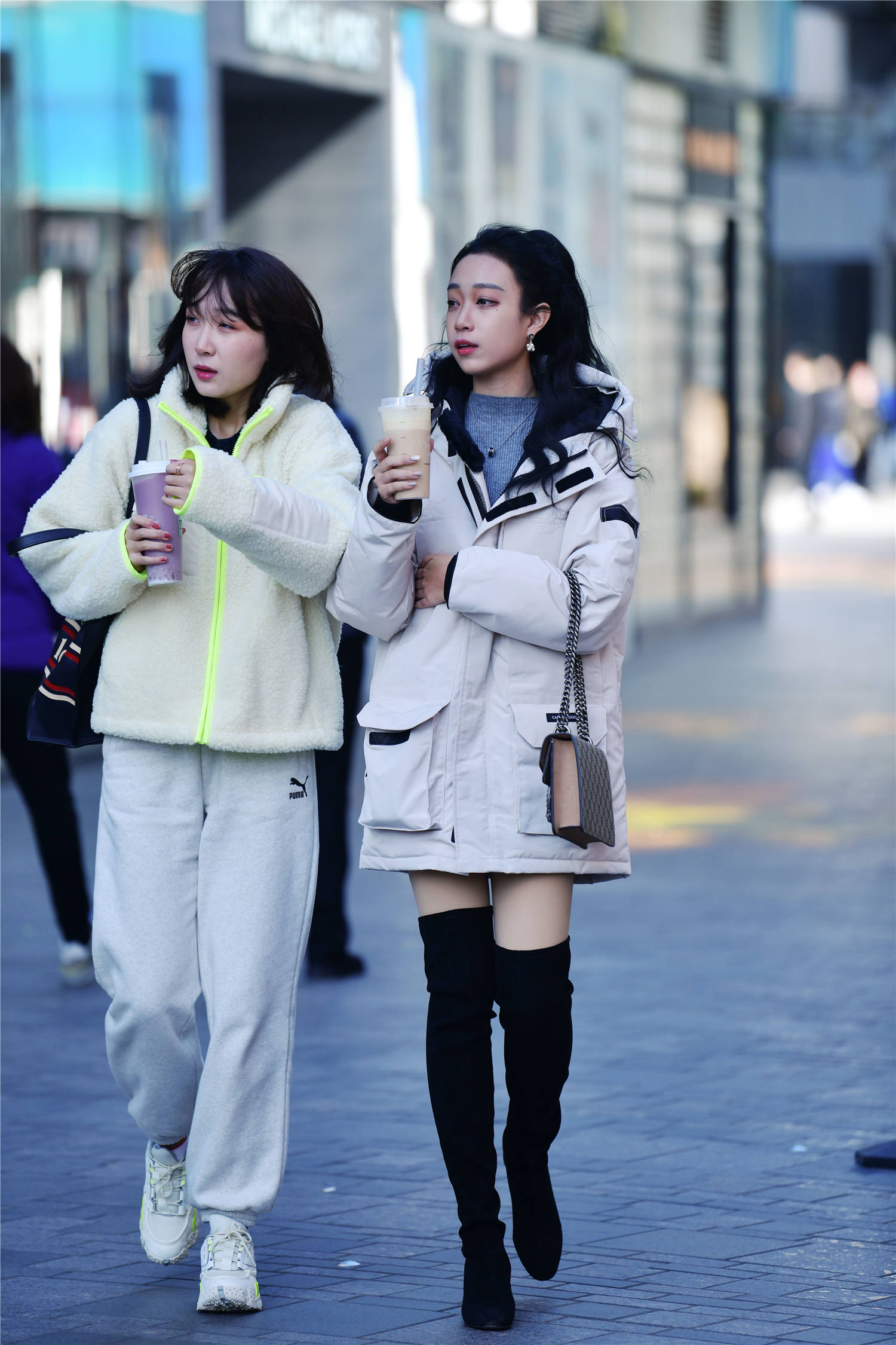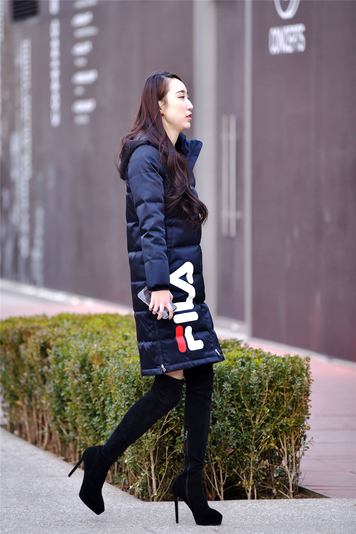选择长靴搭配,冬季会让你变得不一样,好看时尚,搭配简单,还会有层次感,这位美女选择一款黑色绒面过膝长靴,修身的靴筒,更展现出姑娘的骨感身材,10厘米的鞋跟,更好衬托身材,前面的防水台,简单都很好看,而且冬天还会有着不错的保暖效果,一件中长款的羽绒服,刚好和靴子相接,这样走路的适合,偶尔会露出一点靴子边缘,非常好看的搭配。