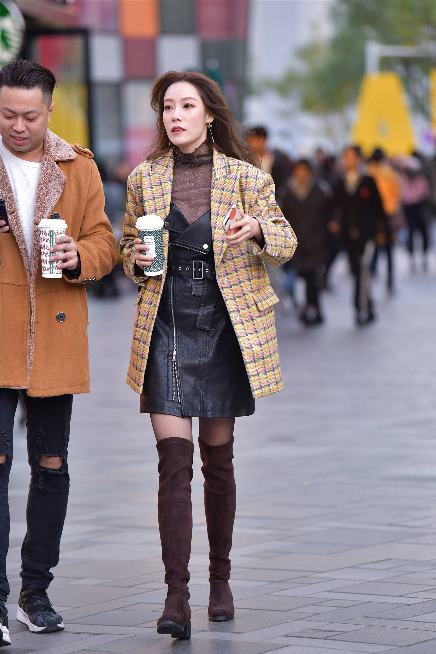 很多时尚姑娘,会穿出层次的服装,展现出很简约的搭配效果,看一下这位美女的穿搭,一双深灰色的过膝长靴,2厘米的方跟,对于美女来说就是一双平底,修身的款式搭配黑色丝袜,穿靴子会很方便黑色的皮裙,金属拉链黑腰带设计,非常层次感,还衬托身材比例,衬衣是一件黑色镭射透视高领小衫,非常精致的搭配,外面一件黄色格子西装,增加色彩。