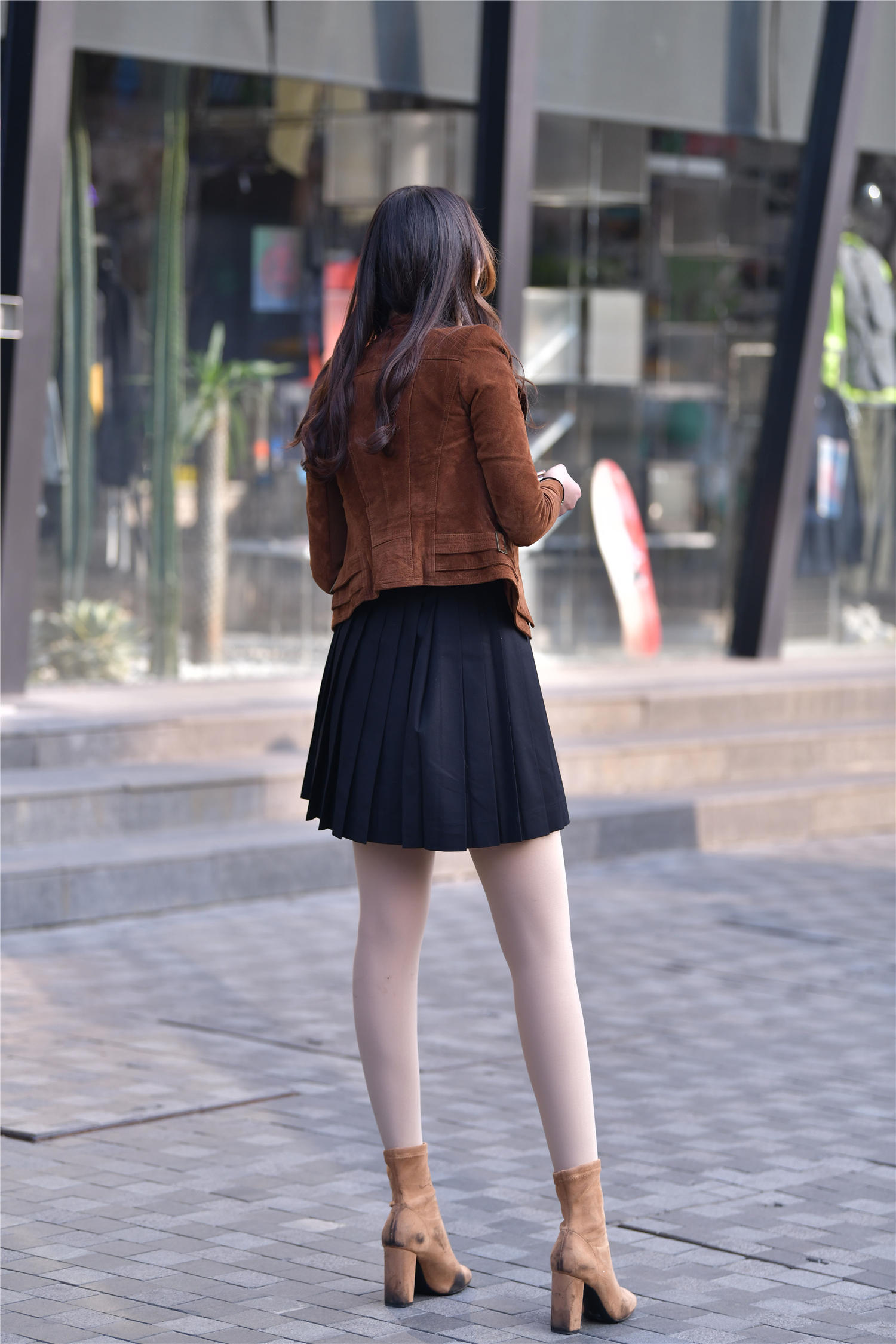 很多身材高挑的姑娘,她们选择的搭配,也会更好地衬托比例,当你经常搭配的时候,就会越来越顺手,而且挑选衣服的时候也会很轻松,知道自己适合什么风格,想要选择什么款式的服装,这位姑娘身材匀称,黑色高腰百褶裙搭配一件棕色的磨砂皮夹克,短衣襟更显身材,脚下一双棕色粗高跟短靴,更好地展现身材,也突出大长腿,偏白色打底裤,修身显瘦效果很好。