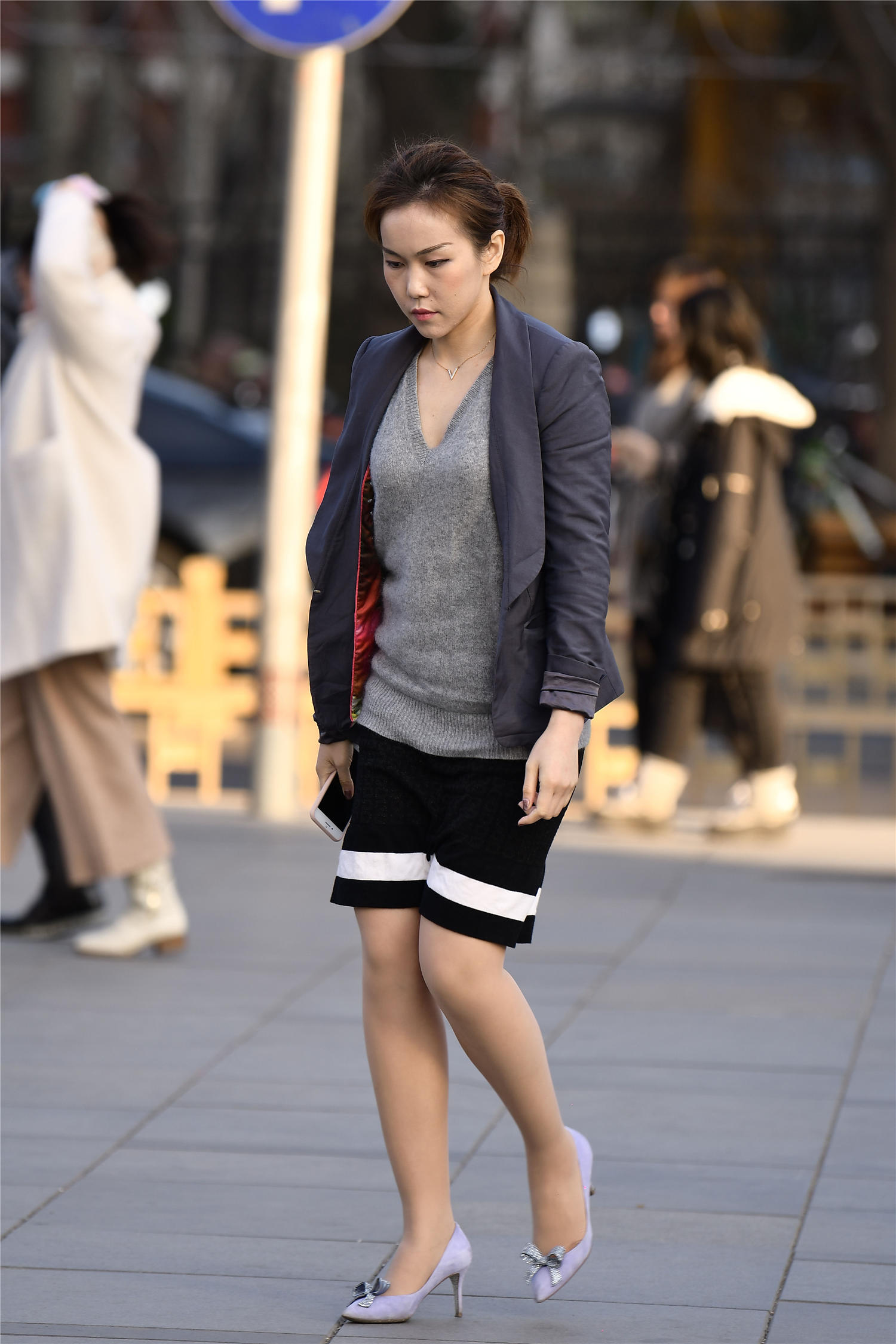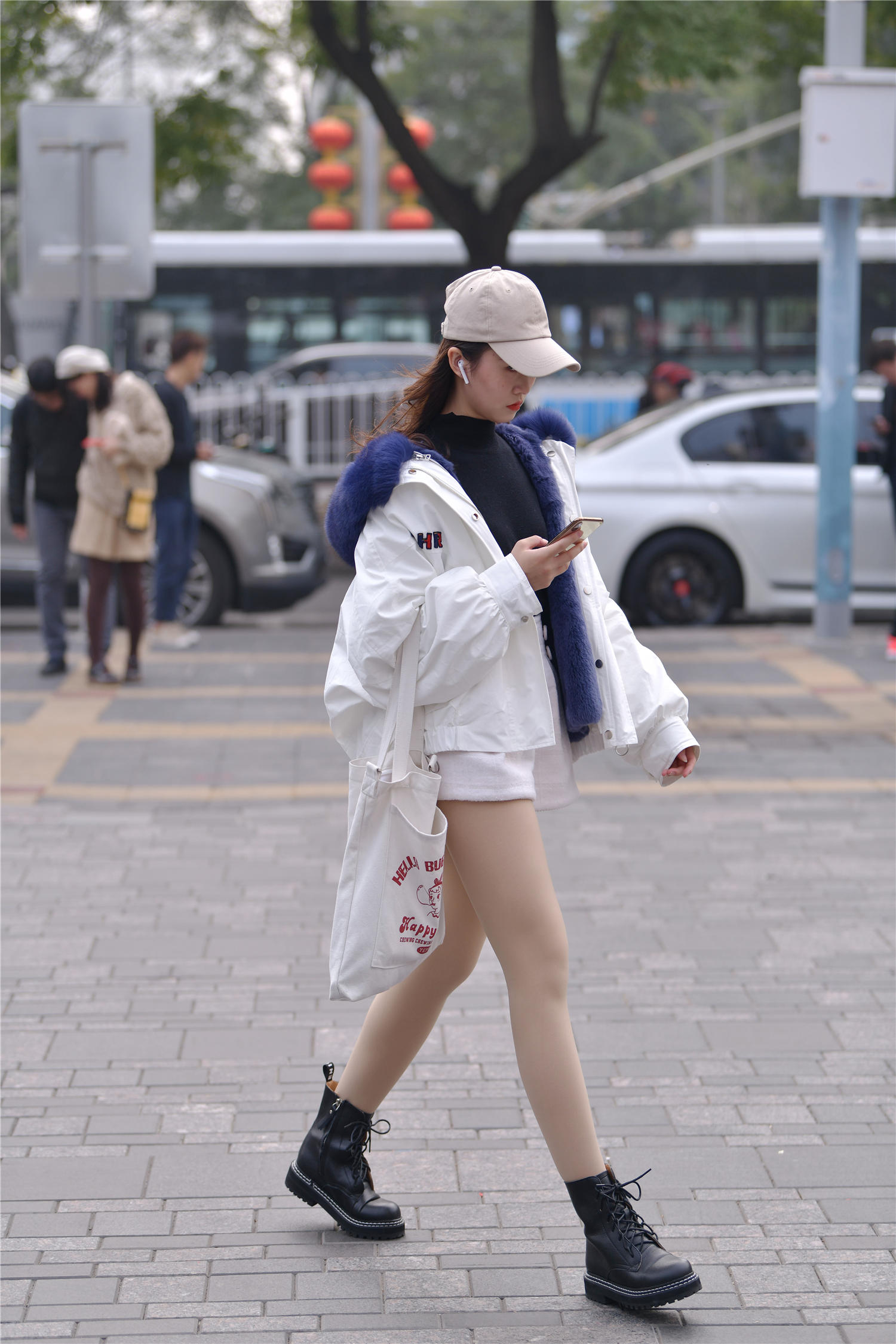 到了冬天,很多姑娘的搭配不仅有层次,还注意保暖,在这个季节想要展示身材,还不受冻,这款“神器”不能少,就是带绒的修身打底裤,也被称作“光腿神器”,看一下这位美女,选择的偏白色的打底裤,还套上一件黑色高筒袜,增加色彩的效果,搭配一条皮质短裤,非常精致,脚下穿着一双平底皮鞋,一件羊羔毛的短款外套,厚实有很保暖。