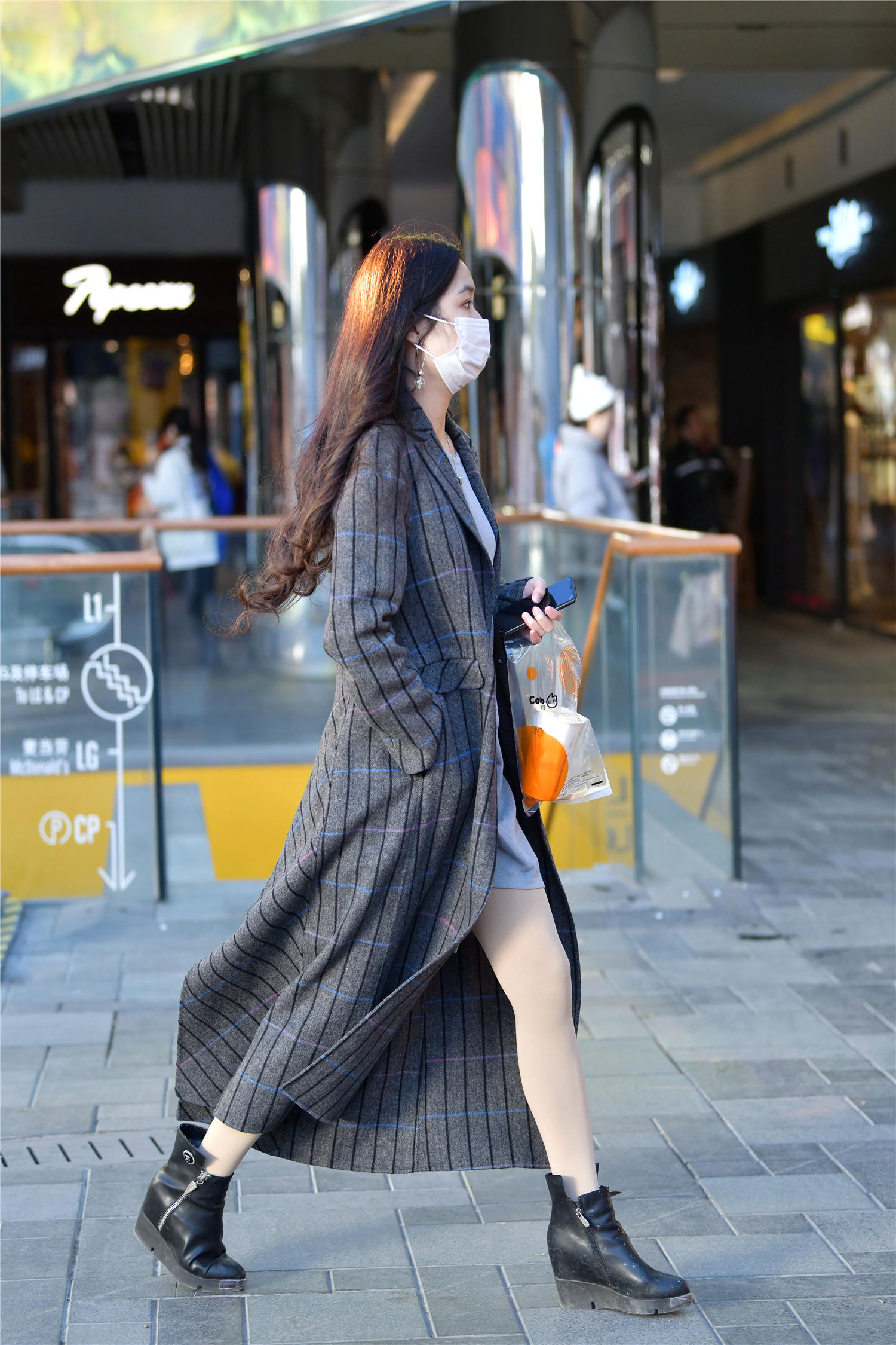 时尚姑娘,在冬天会展现自己,搭配出精致的效果,看一下这位美女的穿搭,一件长款的风衣,深灰色的格子,浅蓝色的横纹,增加层次感,里面穿着一件浅蓝色的连衣短裙,非常简约却又很有层次的搭配,偏白色的打底裤,修身效果很好,也展现出身材纤细的效果,一双黑色皮质短靴,厚底的款式,会很舒服,也有着很好的保暖效果。