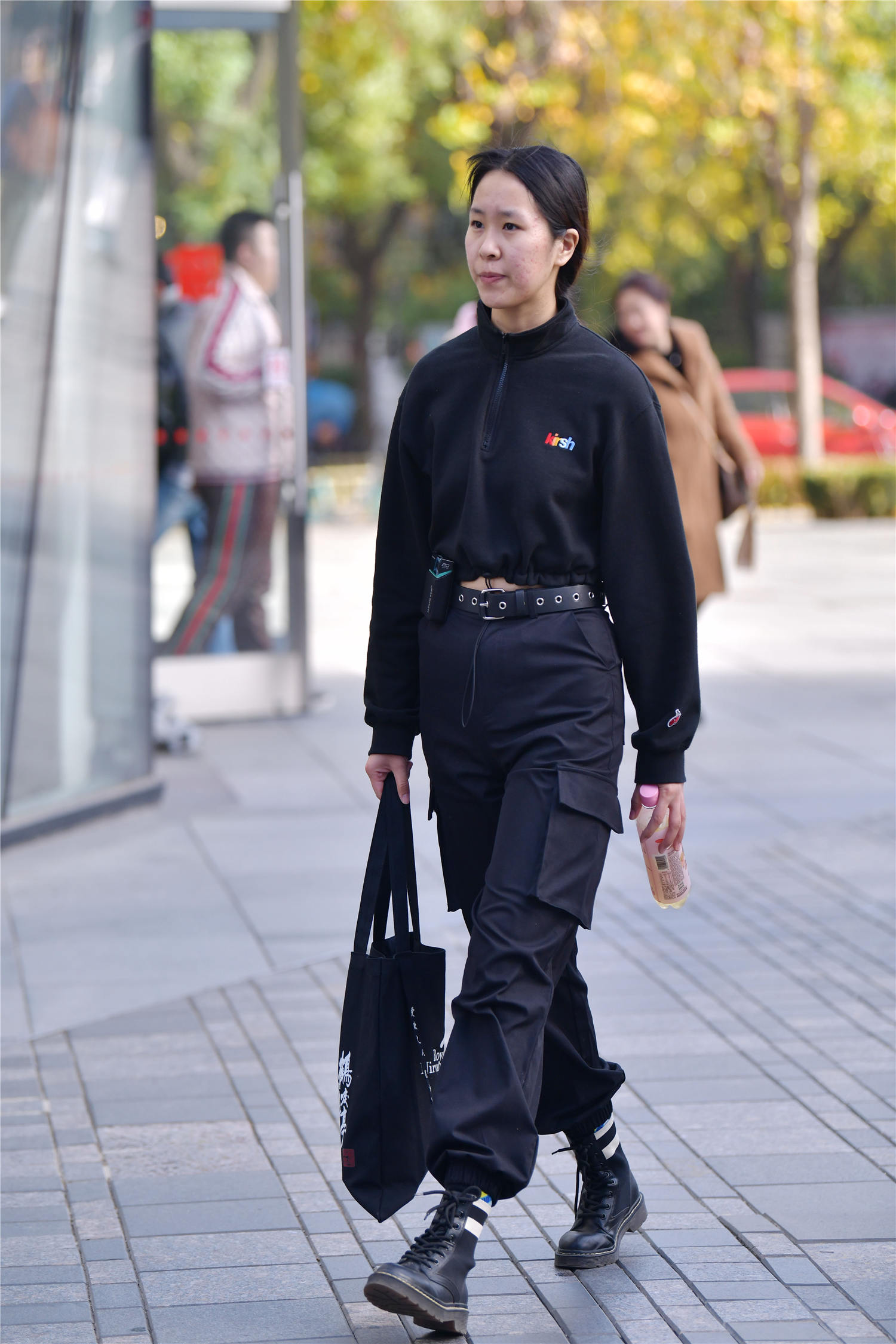 时尚的姑娘,会想着自己搭配出不一样的味道来,到了冬季,长裤的搭配变得更加多了,那么怎么用长裤搭配出精致时尚,还展现出自己的风格呢,到时尚街区了解一下,现在的姑娘都选择什么样的长裤,这位美女选择黑色的工装裤,搭配卫衣,有着干练和中性风的感觉,脚下的马丁短裤,裤脚收到短靴里面,看起来就很个性的效果。