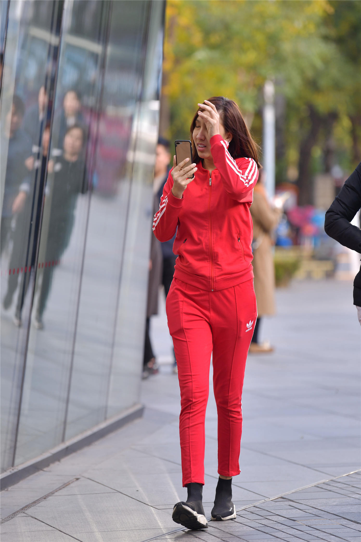 到了冬季,搭配长裤是比较常见的,但是穿出什么风格,要有自己的想法,可以搭配出运动风格,这位美女一身红色运动服,也会展现出很精致的感觉,运动裤有着一点修身的效果,裤脚九分长度,脚下穿着一双运动袜靴,这样有着显瘦的效果,而且很有这个性的感觉,是不是这样的搭配很好看呢。