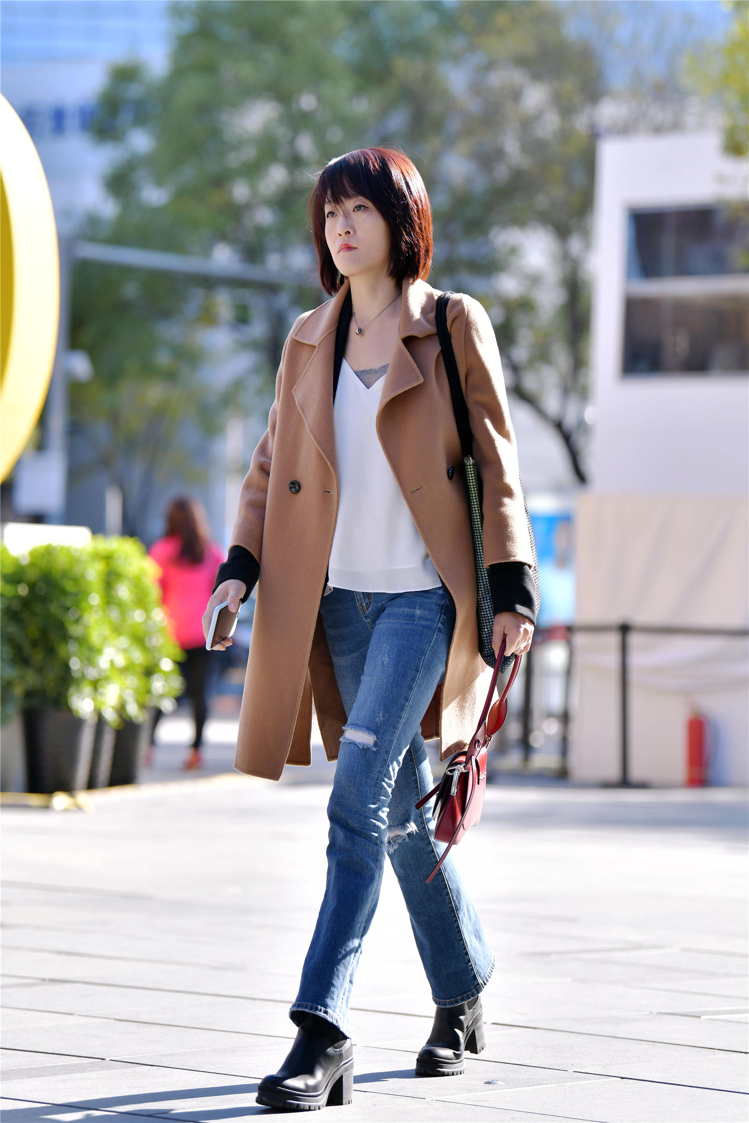 在冬天的长裤搭配中,牛仔裤是不能缺少的,牛仔裤的款式看似很少,但是每个人的穿搭都会不同,这位美女选择一款蓝色牛仔裤,还要有破洞的效果,裤脚有着一点喇叭筒的效果,很个性,脚下穿着粗跟的皮质短靴,会显得正式一些,白色小衫搭配一件中短款的驼色呢子大衣,这样冬天也不会很冷了。