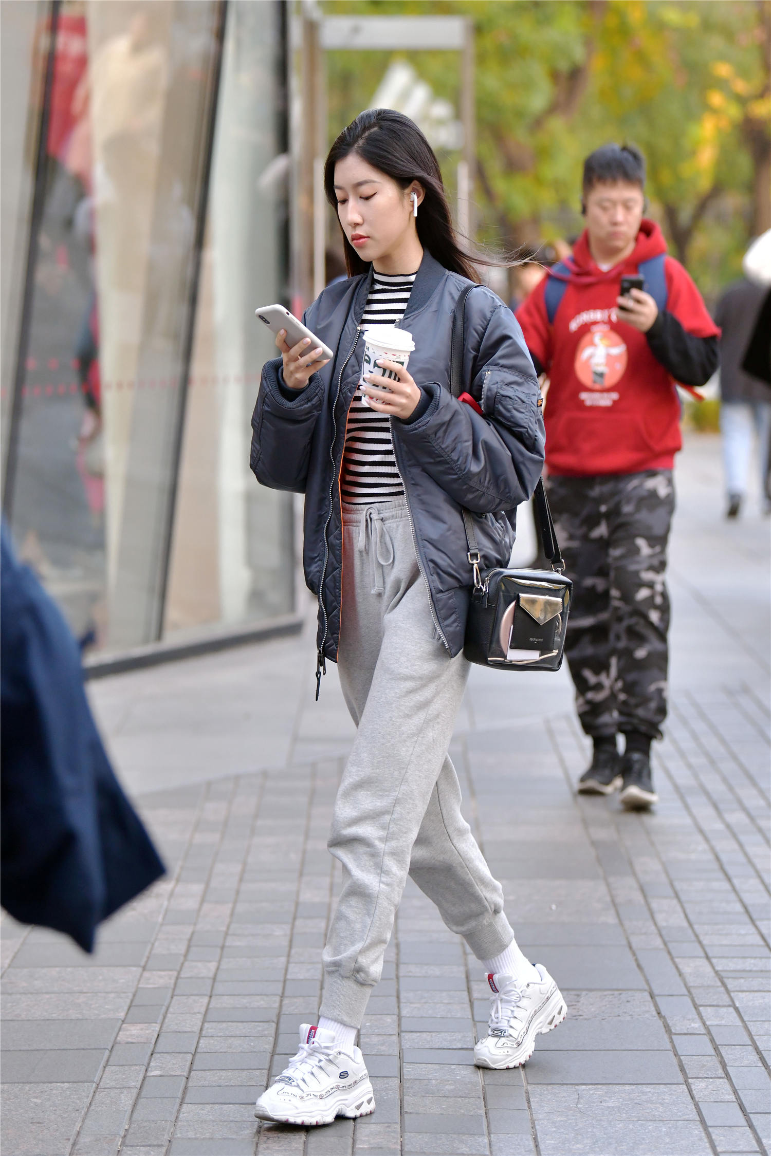 穿出自己的个性,搭配出自己的风格,年龄不一样,搭配想法不同,也会穿出不一样的风格,这位年轻的姑娘,喜欢休闲运动一些,所以选择浅灰色的运动长裤,收紧的裤脚,显得非常休闲,白色的运动鞋,搭配白色袜子,简单有很好看,横条纹的修身小衫,外面一件深色夹克,简简单单的搭配出邻家女孩的感觉。