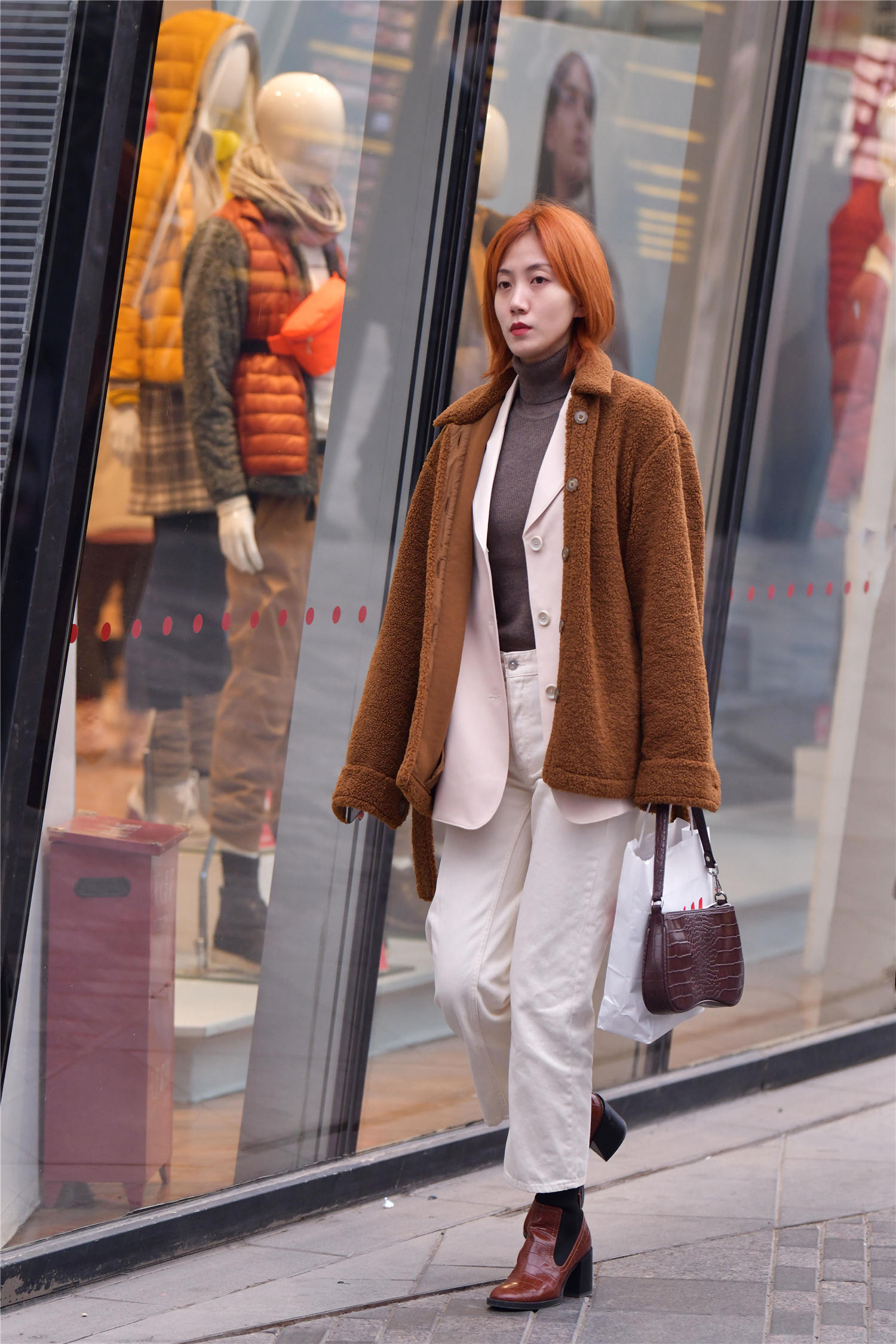 对于很多人的搭配,都是有着一点混搭的效果,选择的裤子和服装,不一定就是套装,而是搭配随意一些,这样会有着不一样的感觉,看一下这位美女的穿搭,一条米白色的高腰裤,直筒的设计,九分的裤长,搭配棕色皮质粗跟短靴,很有意思,深灰色的修身高领衫,搭配浅粉色的西装,外面一件摇粒绒的短款外套,看着就很暖和的感觉。
