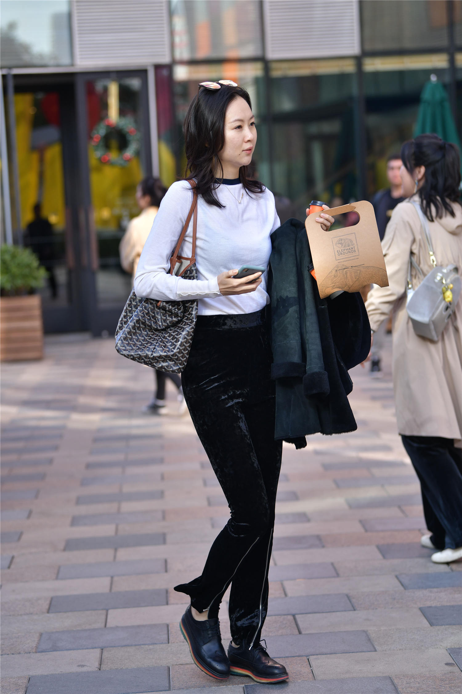 选择一款好看的裤装,还要搭配出精致的感觉,对于时尚姑娘来说,不是太难,但是要知道自己适合什么样的搭配,这位美女选择一款黑色丝绒的高腰长裤,裤脚的拉链设计,增加层次,也可以让自己走路带风,一件白色长袖,搭配出很精致的感觉,臂弯里一件大衣,在觉得冷的时候,可以穿上,时尚美女还是会注意保暖的。